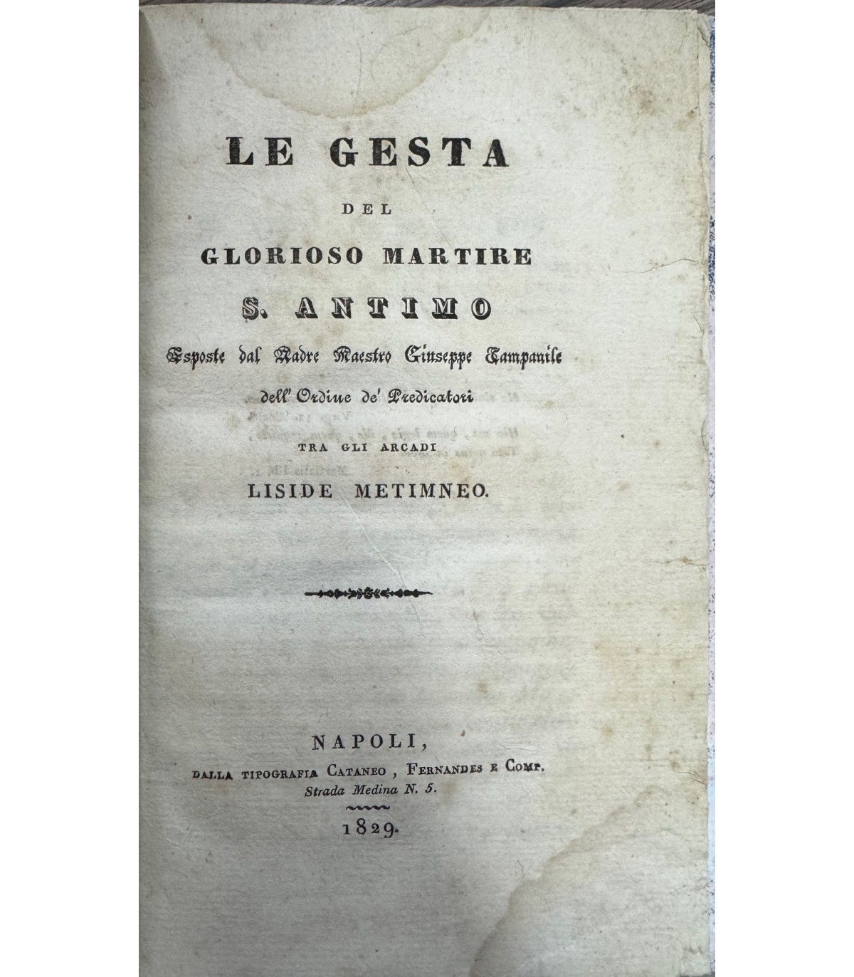 Esposte da Padre R.G. Campanile tra gli arcadi Liside Metimneo. Napoli. Cataneo / Fernandes 1829, 16°, pp. 72, alone di bruniture all'angoo inferiore. Leg, mz pelle moderna, tass.