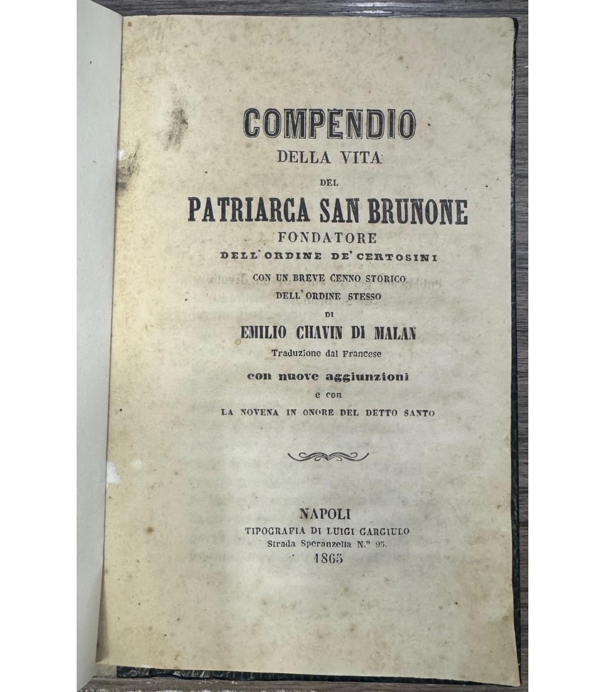 Fondatore dell'ordine de certosini con un breve cenno storico dell'ordine stesso. Con nuove aggiunzioni e con la novena in opnore del detto santo. Napoli. Gargiulo 1863, 16°, pp. 92, con una tavola incisa f.t. Leg, mz perg. Coeva. Bruniture.