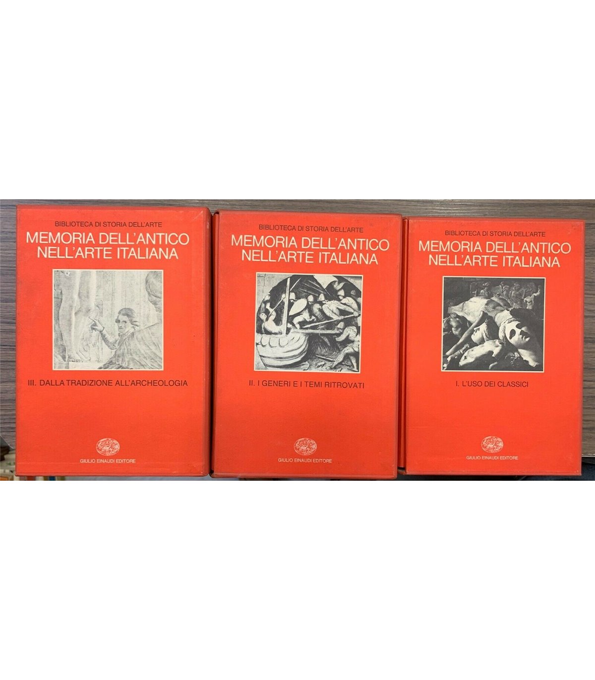 3 voll. I. L'uso dei classici. II. I geni e i temi ritrovati. III. Dalla tradizione all'archeologia. Torino. Einaudi 1984, 8°, pp. XXVII+477+XXXIV+478+XXXV+538. Illustrato da tavole in nero f.t. Leg. Edit., sovracc. Cofanetti. Odore di chiuso e segni del tempo ma buon esemplare.