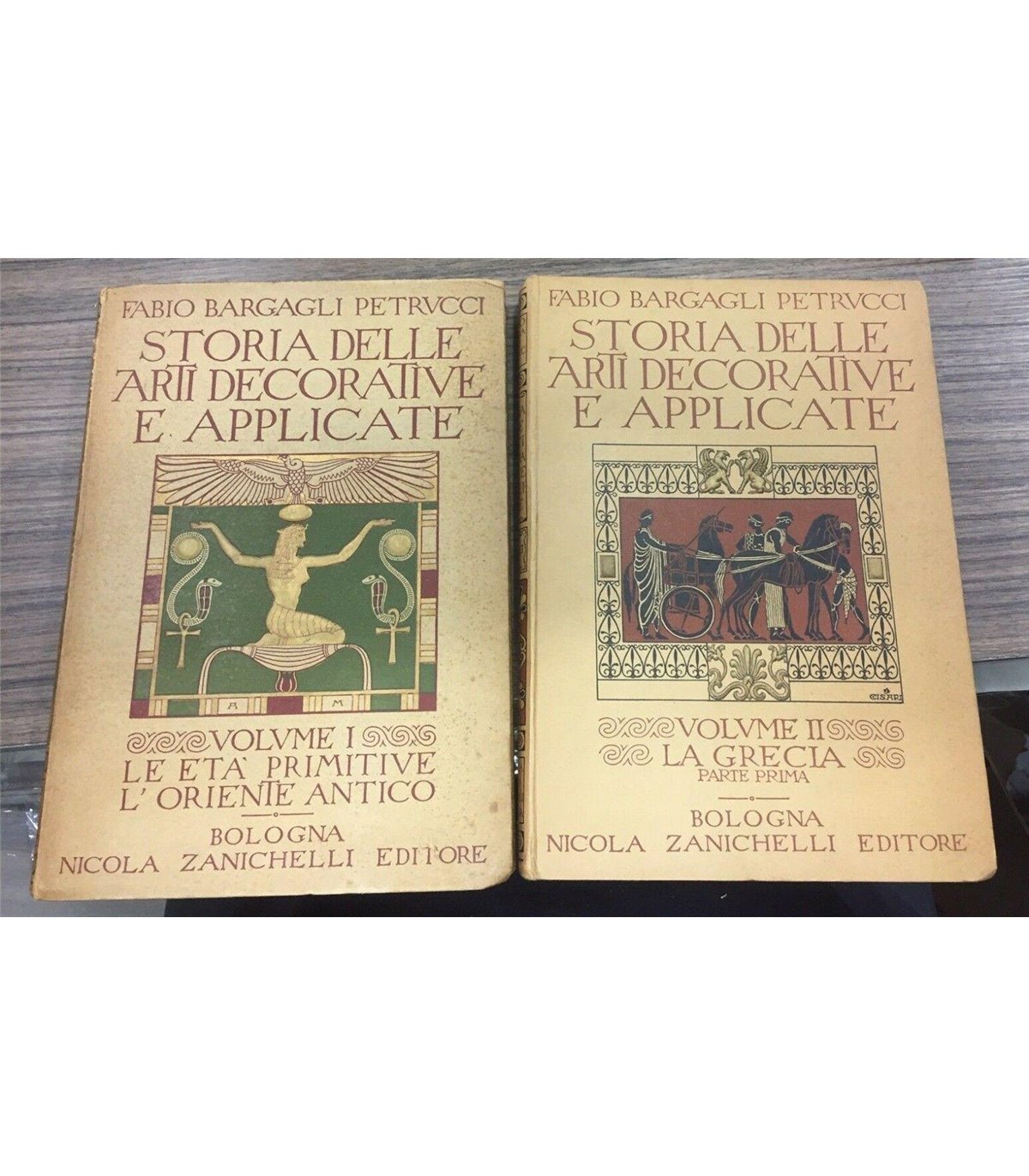 I. Le età primitive - L'oriente antico. II. La Grecia. Parte prima. Bologna. Zanichelli 1932, 8°, pp. 220+220. Con numerose illustrazioni in ero e tavole a colori f.t. Qualche pagina semiattaccata ma facilmente staccate senza danni. Leg. Artisticamente illustrata a rilievo al piatto, con qualche segno del tempo.