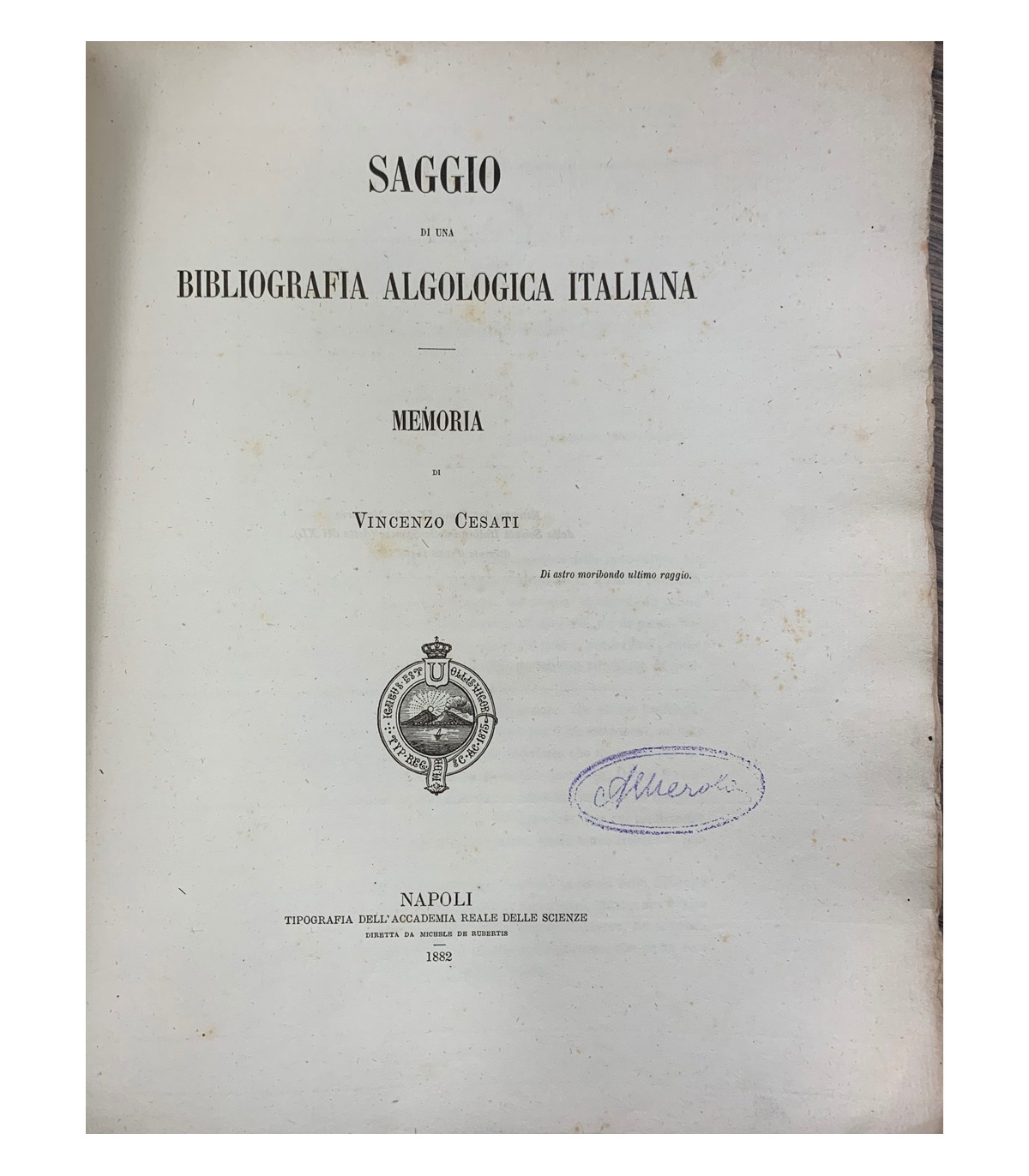 Memoria di Vincenzo Cesati. Napoli. Tipogr. Dell'Accademia Reale delle Scienze 1882, 4°, pp. 78. Dorso rotto. Invio dedica alla brossura muta.