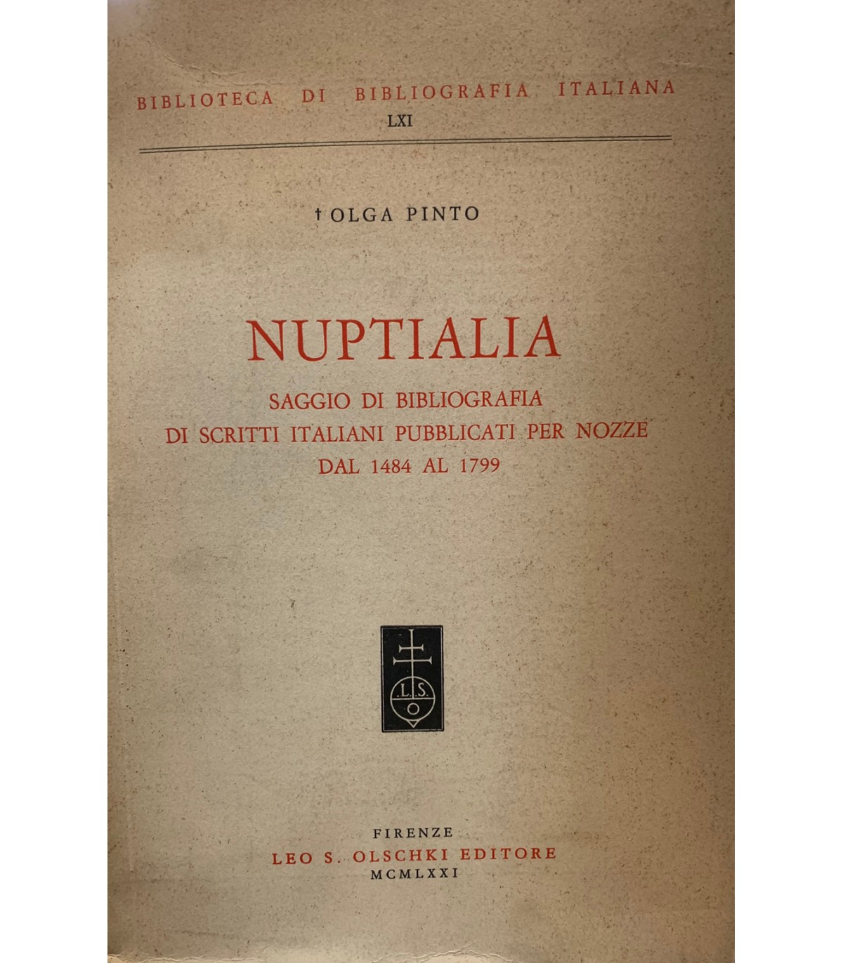 Saggio di biblliografia di scritti italiani pubblicati per nozze dal 1484 al 1799. Firenze. Olschki 1971, 8°, pp. ZZV+440. Bruniture e segni del tempo.
