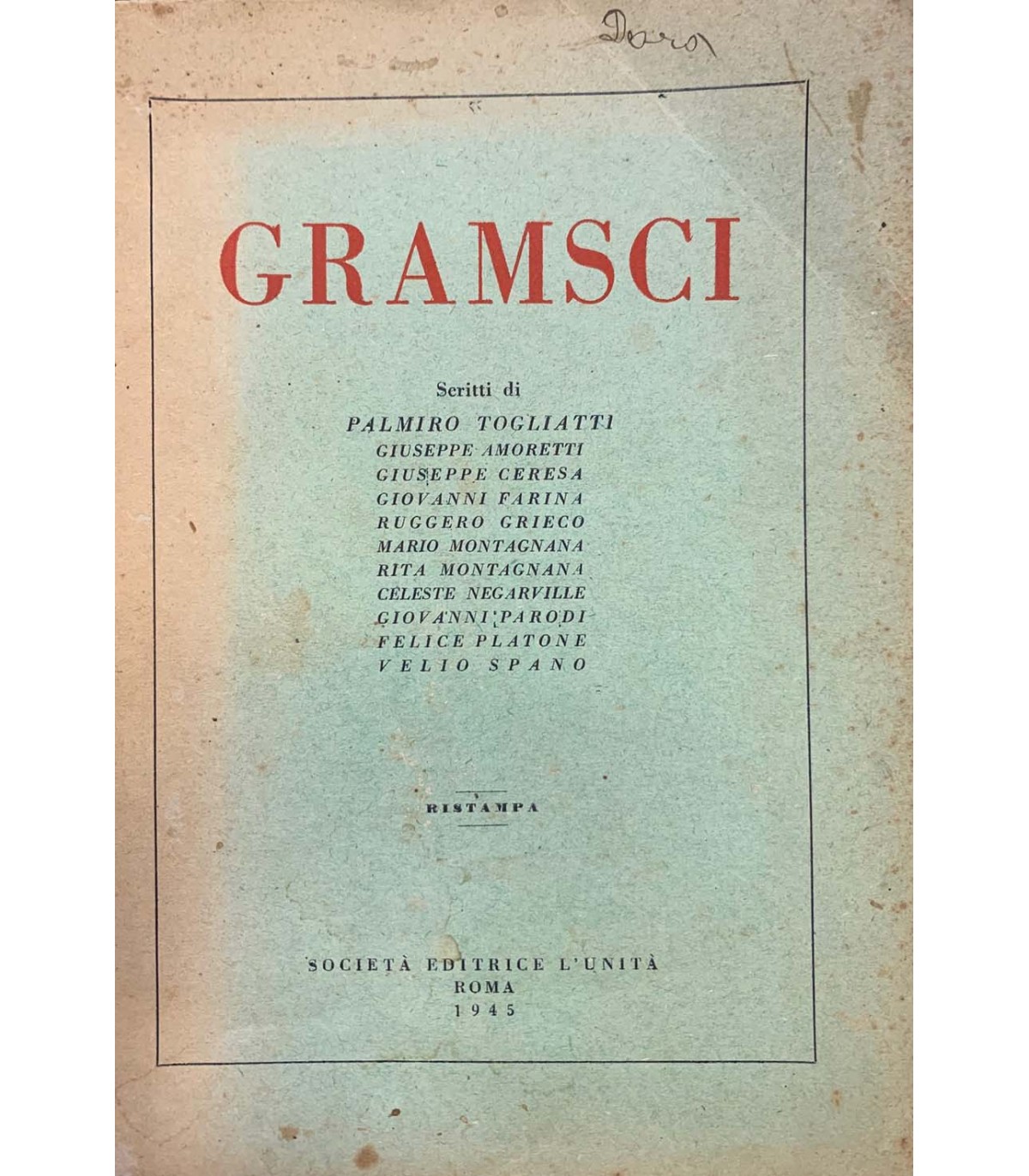 Scritti di Togliatti, Amoretti, Ceresa, Farina, Grieco, Mantagnana. …Roma. L'unità 1945, 16°, pp. 192. Bruniture. Bross