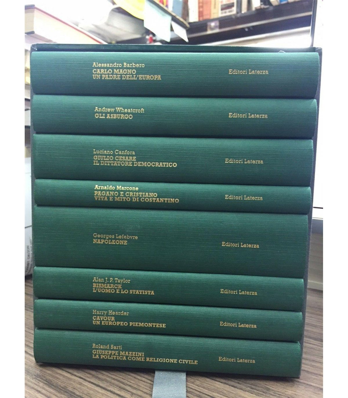 Cofanetto editoriale contenente: 1. Wheatcroft A. Gli Asburgo, pp. XX+394. 2. Barbero A. Carlo Magno. Un padre dell'Europa, pp. 450. 3. Canfora L. Giulio Cesare. Il dittatore democratico, pp. 506. 4. Marcone A. Pagano e cristiano vita e mito di Costantino, pp. 214. 5. Lefebre Georges. Napoleone, pp. 744. 6. Taylor Alan J. P. Bismarck l'uomo e lo statista, pp. 290. 7. Cavour un europeo piemontese, pp. 268. 8. Sarti G. Giuseppe Mazzini la polticia come religione civile, pp. 348. Bari. Laterza 2003, volumi in 16°. Illustrato da belle foto in nero e a colori f.t. Cofanetto edit. Ottimo esemplare.