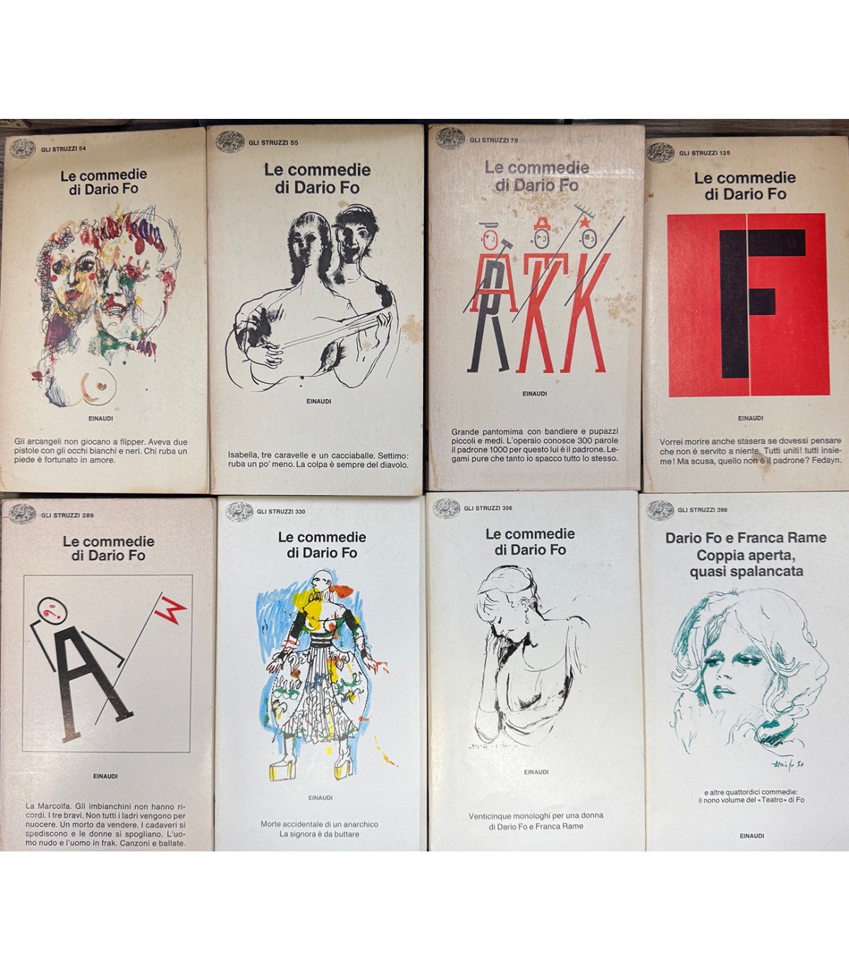 I. Gli arcangeli non giocano a flipper. Aveva due pisole con gli occhi bianchi e neri, Chi ruba un piede è fortunato in amore. II. Isabella, tre caravelle e un cacciaballe. Settimo: ruba un po' meno. La colpa è sempre del diavolo, III. Grande pantomima con bandiere e pupazzi piccoli e medi. L'operaio conosce 300 parole il padrone 1000 per questo lui è il padrone. Legami pure che tanto io spacco tutto lo stesso, IV. Vorrei morire anche stasera se dovessi pensare che non è servito a niente. Tutti uniti! tutti insieme! Ma scusa, quello non è il padrone? Fedayn. VI.La Marcolfa. li imbianchini non hanno ricordi. I tre bravi. Non tutti i ladri vengono per niocere. Un morto da vendere. I cadaveri si spediascono e le donne si spoglaino. L'uomo nudo e l'uomo in frak. Canzoni e ballate VII. Morte accidentale di un anarchico. La signora è da buttare. VIII. Venticinque monologhi per una donna di Dario Fo e Franca Rame. IX. Dario Fo e Franca Rame. Coppia aperta, quasi spalancata e altre commedie il nono volume del "Teatro" di Fo. Torino. Einaudi 1982-1991, 16°, pp. circa 1600. Bruniture.