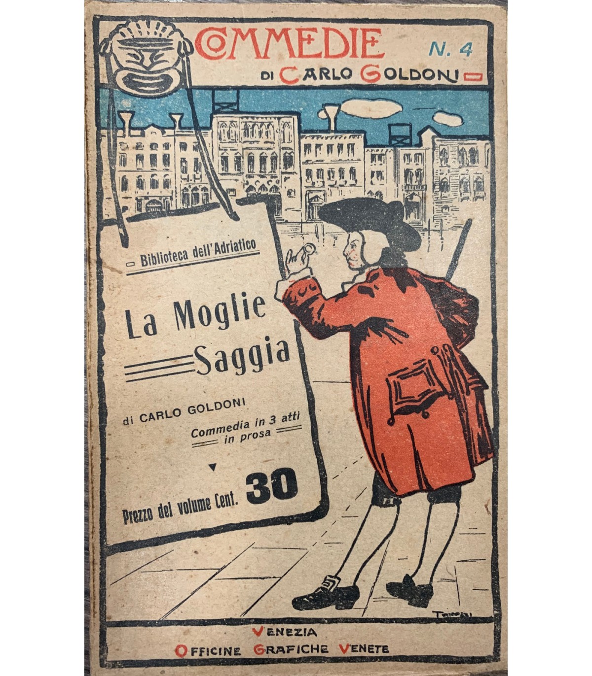 Biblioteca dell'Adriatico. Commedia in 3 atti. Venezia. Arti Grafiche Venete 1909, 16°, pp. 80, con un ritratto. Bross. Illustrata. Segni del tempo.