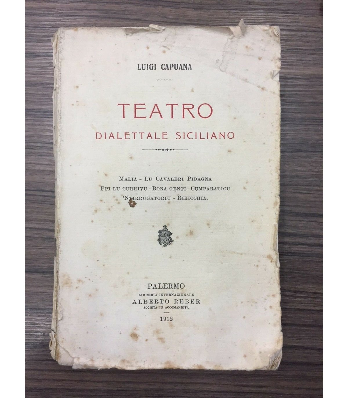 Malia - Lu Cavaleri - Pidagna - ppi lu currivu - Bona genti - Cumparaticu - Ntirrugatoriu - Riricchia. Palermo. Reber 1912, 16°, pp. XVI+530. Bross. Edit. Sciupata con dorso stanco. Bruniture.