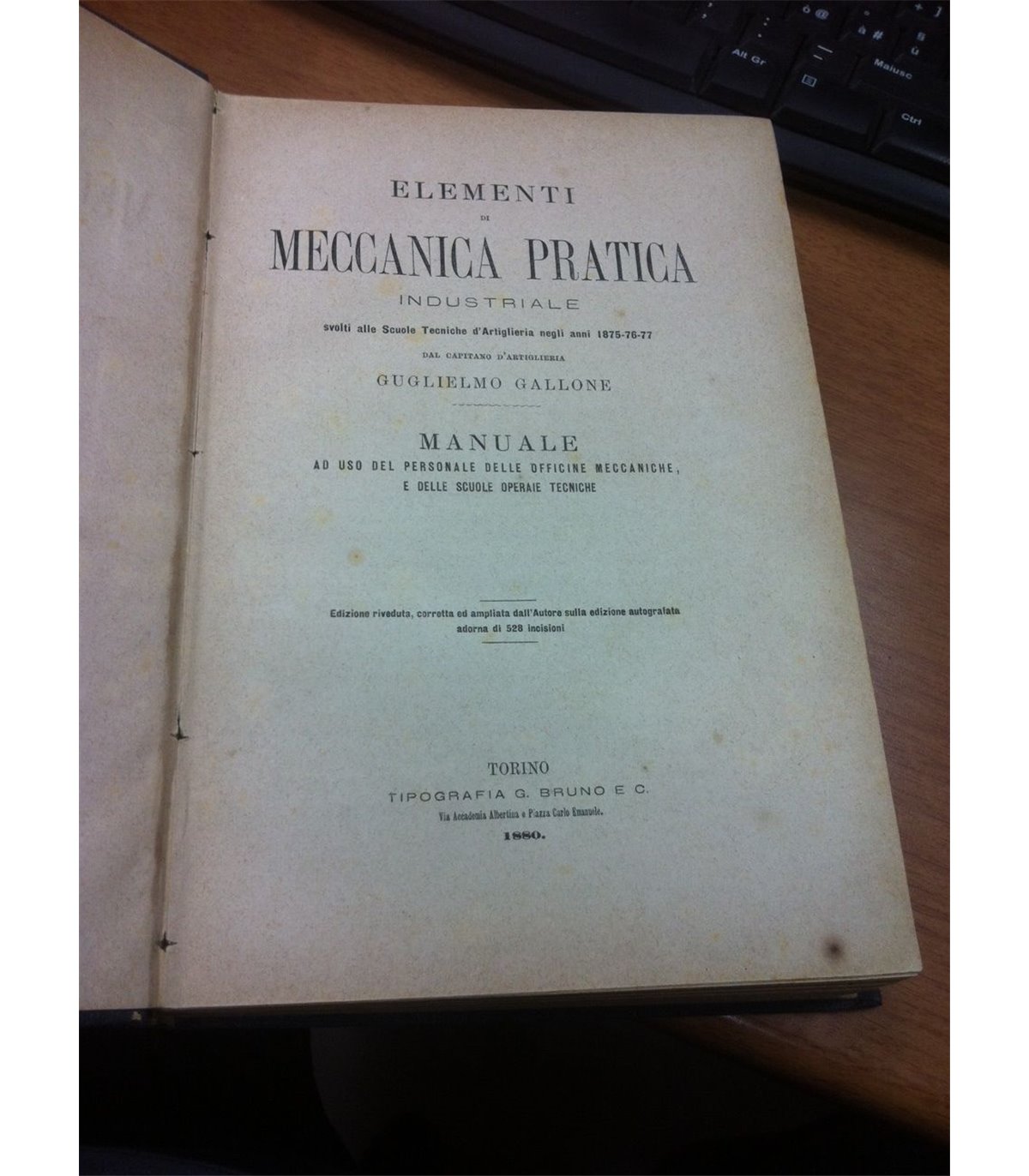 Manuale ad uso del personale delle officine meccaniche e delle scuole operaie tecniche. Torino. Bruno 1880, 8°, pp. 646, con 528 incisioni. Leg. t.t., tit. in oro al dorso. e al piatto.