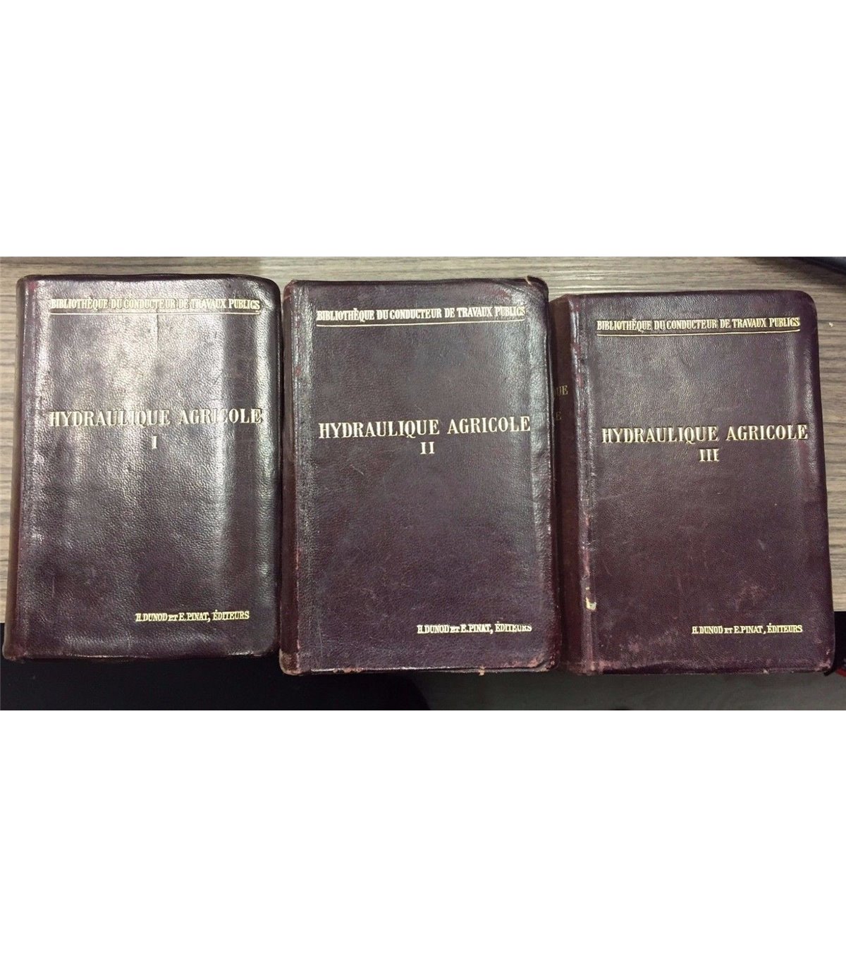 Tome I. Considerations gènereales sur les cours d'eau réglementation des barrages sur cours d'eau non navigables ni flottables maintien du libre ecoulement des eaux. Tome II. Des Irrigations. Tome III. Assanissementes et desséchements - Comatages - Polders - Drainage - Utilisation agricole des eaux dégout - Annexes. Paris. Vico-Dunod et C. 1900-1910, 16°, pp. X+628+VIII+668+VIII+560, con illustrazioni nel testo e tavole ripieg. f.t. Leg. Piena pelle editoriale con tit. in oro al dorso e al piatto. Spellature segni del tempo e bruniture.