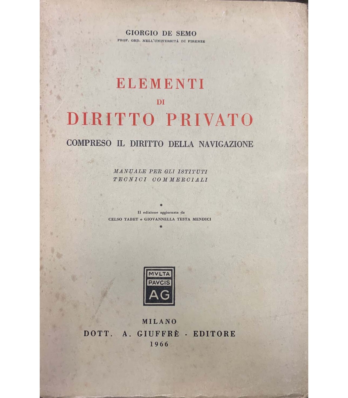 Compreso il diritto della navigazione. Manuela per gli istituti tecnici commerciali. Milano. Giuffrè 1966, 16°, pp. 645. Intonso. Bruniture.