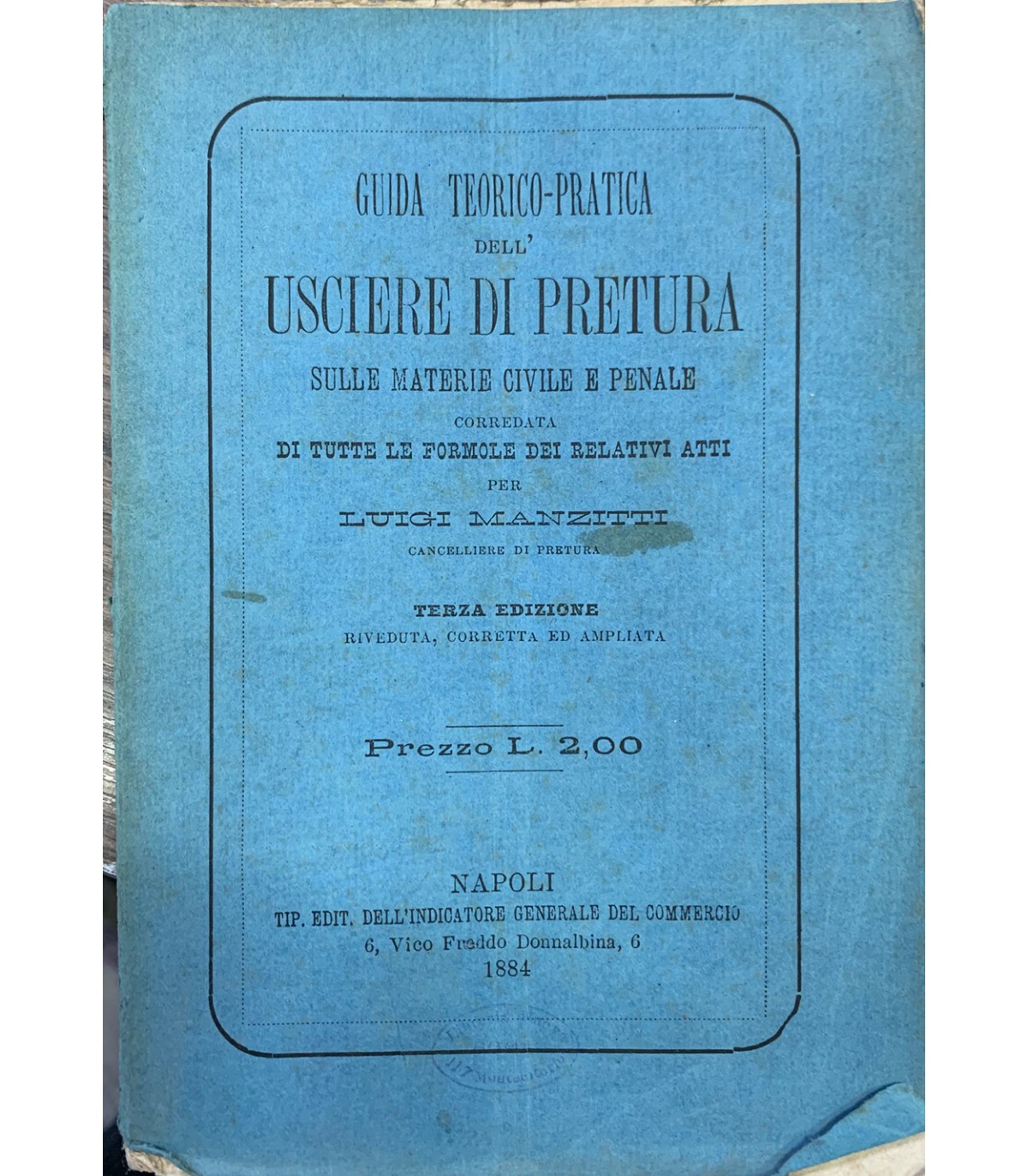 Corredata di tutte le formole dei relitivi atti. Napoli 1884, 16°, pp. 368. Bross. Con piccole mancanze al dorso.