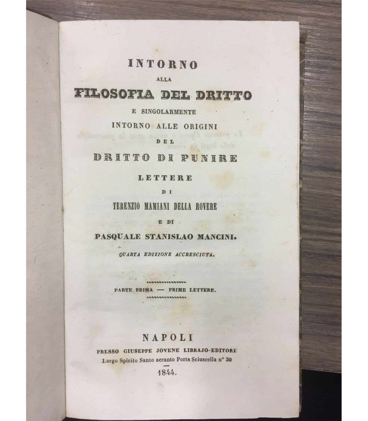 2 parti in unico volume. Lettere di Terenzio Mamiani della Rovere e di Pasquale Stanislao Mancini. Quarta edizione accresciuta. Parte prima - Prime lettere. Parte Seconda. Nuove lettere. Napoli. Jovene 1844, 16°, pp. CXLV+CIV. Leg. Mz pelle, tit. e fregi in oro al dorso. Segni del tempo.