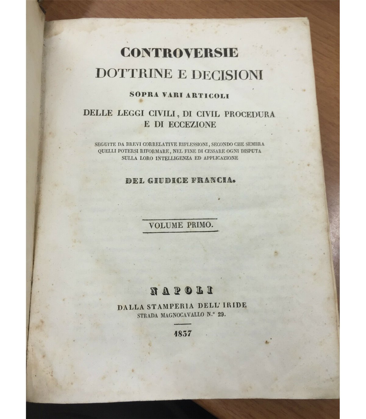 2 voll. in unico tomo. Seguite da brevi correlative riflessioni, secondo che sembra quelli potrersi riformare, nel fine ogni disputa sulla loro intelligenza ed applicazione del giudice Francia per il primo volume per il secondo per il consigliere della suprema corte di giustizia di Francia. Napoli. Tip. Iride - Raimondi 1857-1858, 8°, pp. 348+316.. Firma dell'autore alla fine dei volumi Leg, mz pelle, tit. e fregi in oro al dorso. Piatti con mancanze marginali e ai piatti. Bruniture sparse dovute al tipo di carta.