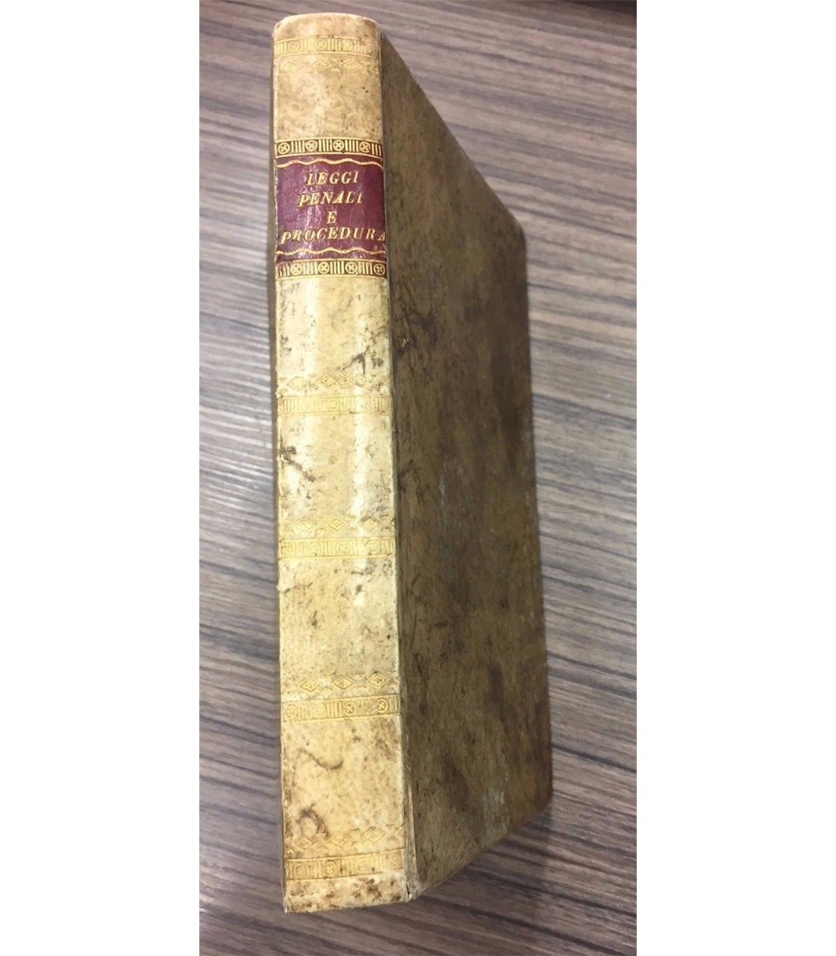 E corredate di un breve comentario, che si pubblica con Real privilegio. Seconda edizione notabilmente accresciuta e migliorata, in cui a fronte di ciascun articolo del testo si trovano tutte le modificazioni e delucidazioni, che dal 1819 epoca della pubblicazione del Codice, sono state fin oggi portate sulle Leggi Penali da Decreti, Regolamenti, Rescritti, Ministeriali, e Decisioni della Suprema Corte di Giustizia. Napoli. Stamperia del Fibreno 1835, 16°, pp. 192. Bruniture. Unito: Leggi della procedura ne' giudizi penali contenente nella quarta parte del codice per lo Regno delle due Sicilie e corredate di un breve commentario, che si pubblica con real privilegio. Seconda edizione notabilmente accresciuta e miglkiorata, in cui a fronte di ciascun articolo del testo si trovano tutte le modificazioni e delucidazioni che dal 1819 epoca della pubblicazione del Codice, sono state fin oggi portate sulle Leggi di Procedura Penale de' Decreti, Reogolamenti, Rescritti, Ministeriali, Decisioni della Suprema Corte di Giustizia. Napoli. Stamperia del Fibreno 1835, pp. 216. Brunitura alle ultime 20 pagine sul lato superiore dell'angolo bianco che non lede il testo. Leg. piena pelle bazzana, tass. Bruniture.