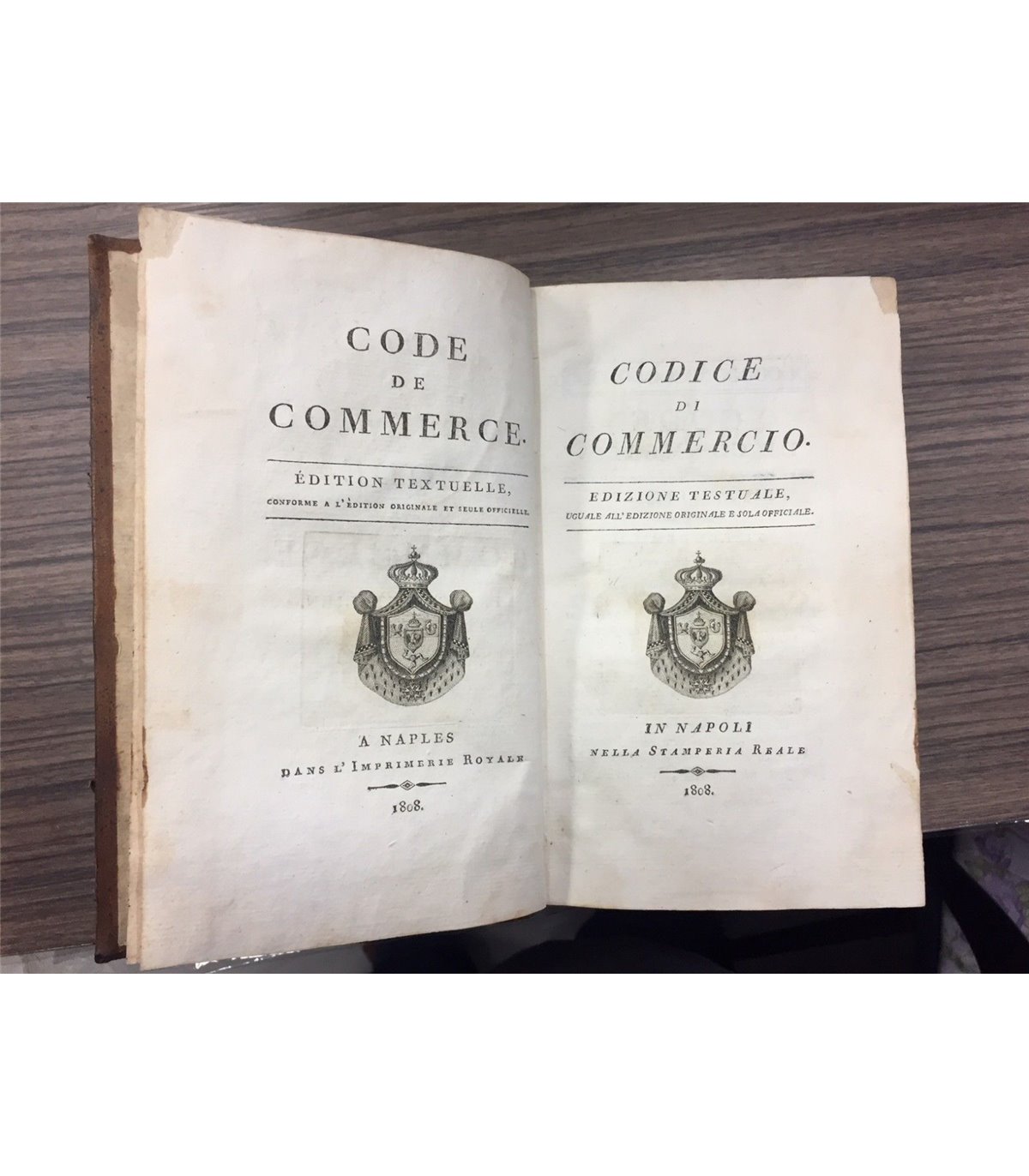 Edizione testuale uguale all'edizione originale e sola ufficialmente. Testo a fronte francese. In Napoli. Stamperia Reale 1808, 16°, pp. 456. Brunitura ai tagli marginale e segni del tempo ma buon esemplare. Bella marca tipografica ai frontespizi. Legatura in piena pelle bazzana, con tit. e fregi in oro al dorso con qualche spellatura specialmente al dorso.
