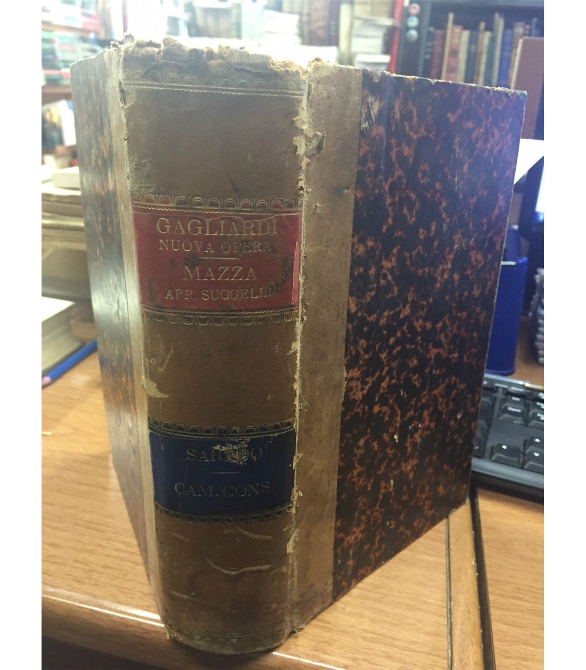 Terza edizione riveduta e corretta su le precedenti dall'autore, e norma della presente codificazione italiana ed arricchita di un completo formulario di atti inservienti a quel giudizio. Napoli. Trani 1867, 16°, pp. 292. Unito: Trattato sull'aposizione e rimozione de suggelli in materia civile, commerciale e penale. Ossia comento ai titoli I,II,III e IV del libro VIII delle leggi di procedura civile ed esposizione di tutte le altre disposizioni legislative, e regolamenti nei quali è ugualmente ordinata o permessa l'apposizione dei sugelli, corredato oltre delle proprie osservazioni dell'autore, della dotttrina dei migliori classici e della giurisprudenza così patria, che delle corti estere, con la citazione di tutte le leggi correlative, reali decreti, sovrani descritti, e ministeriali con i formulari degli atti per cura del Regio Giudice Stefano Mazza. Napoli. Guerrero 1858, pp. 240. Unito: Saredo Giuseppe. Del procedimento in camera di consiglio e specialmente per le materie di volontaria giurisdizione. Commento del titolo I, II e III del libro III del codice di procedura civile per l'avvocato G.S. Volume unico. Napoli. Marghieri 1874, 8°, pp. 363. Leg. mz pelle, tass. Spellature e segni del tempo ma buon esemplare.
