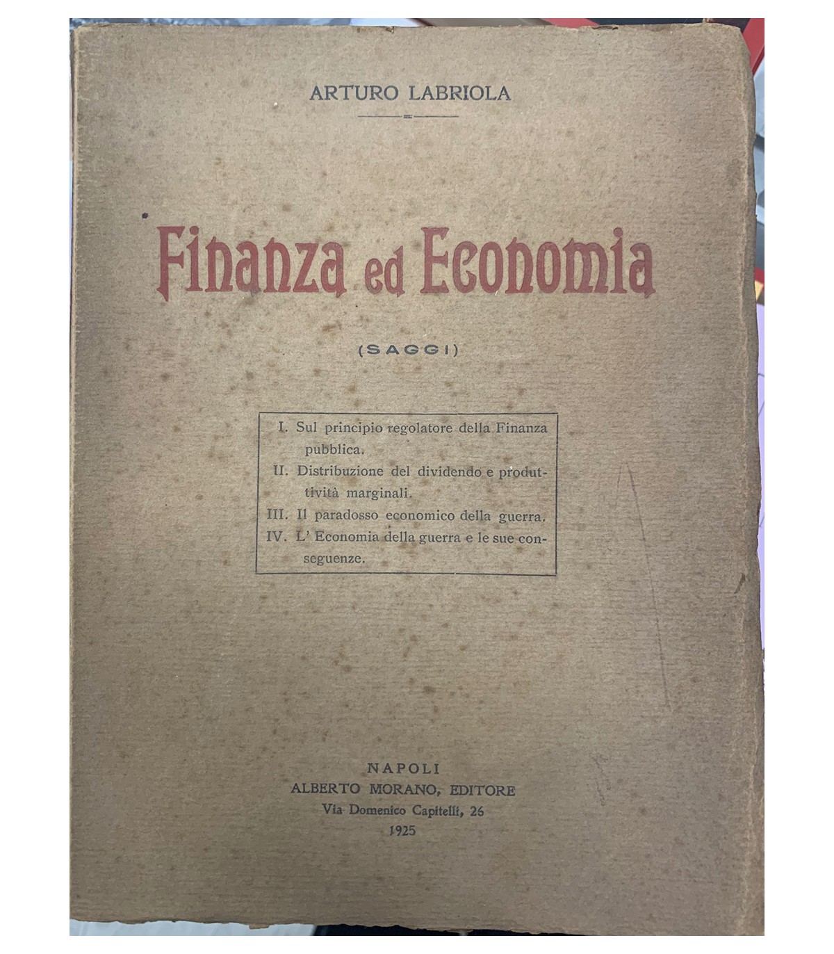 Saggi. Napoli. Morano 1925, 16°, pp. 312. Bruniure. Segni del tempo.
