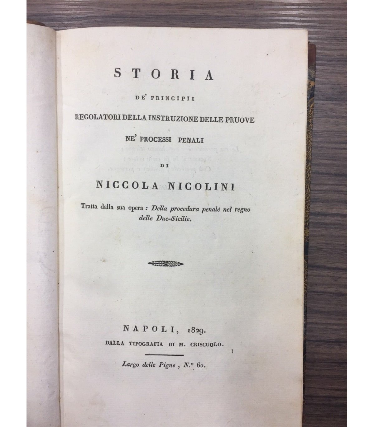 Tratta dalla sua opera: Della procedura penale del Regno delle Due Sicilie. Napoli. Tipografia Criscuolo 1829, 16°, pp. 334. Leg. Mezza pelle, tit. su tass. Al dorso e fregi. Buon esemplare.
