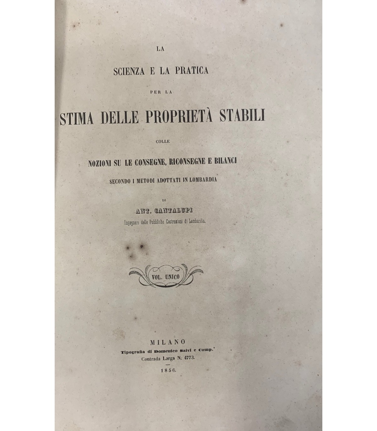 colle nozioni su le consegne, riconsegne e bilanci secondo i metodi adottati in Lombardia Volume Unico. Milano. Salvi 1856, 8°, pp. 596, con figure nel testo. Segni del tempo. Leg. Mz tela muta con tassello in carta cancellato. Parzialmente intonso.