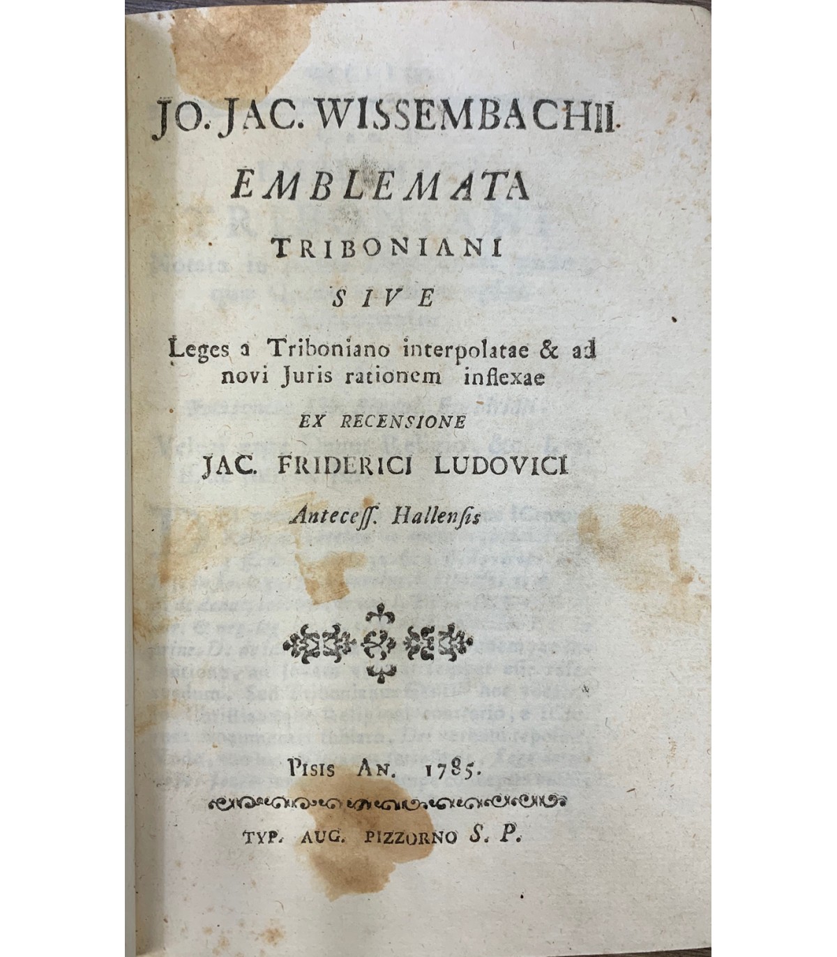 Triboniani sive Leges a Triboniano interpolatae & ad novi Juris rationem inflexae ex recensione jac. Friderici Ludovici. Pisis. Pizzorno 1785, 16°, pp. 256. Bruniture all'angolo superiore che non lede il testo. Leg. Mz pelle, tit. in oro al dorso.