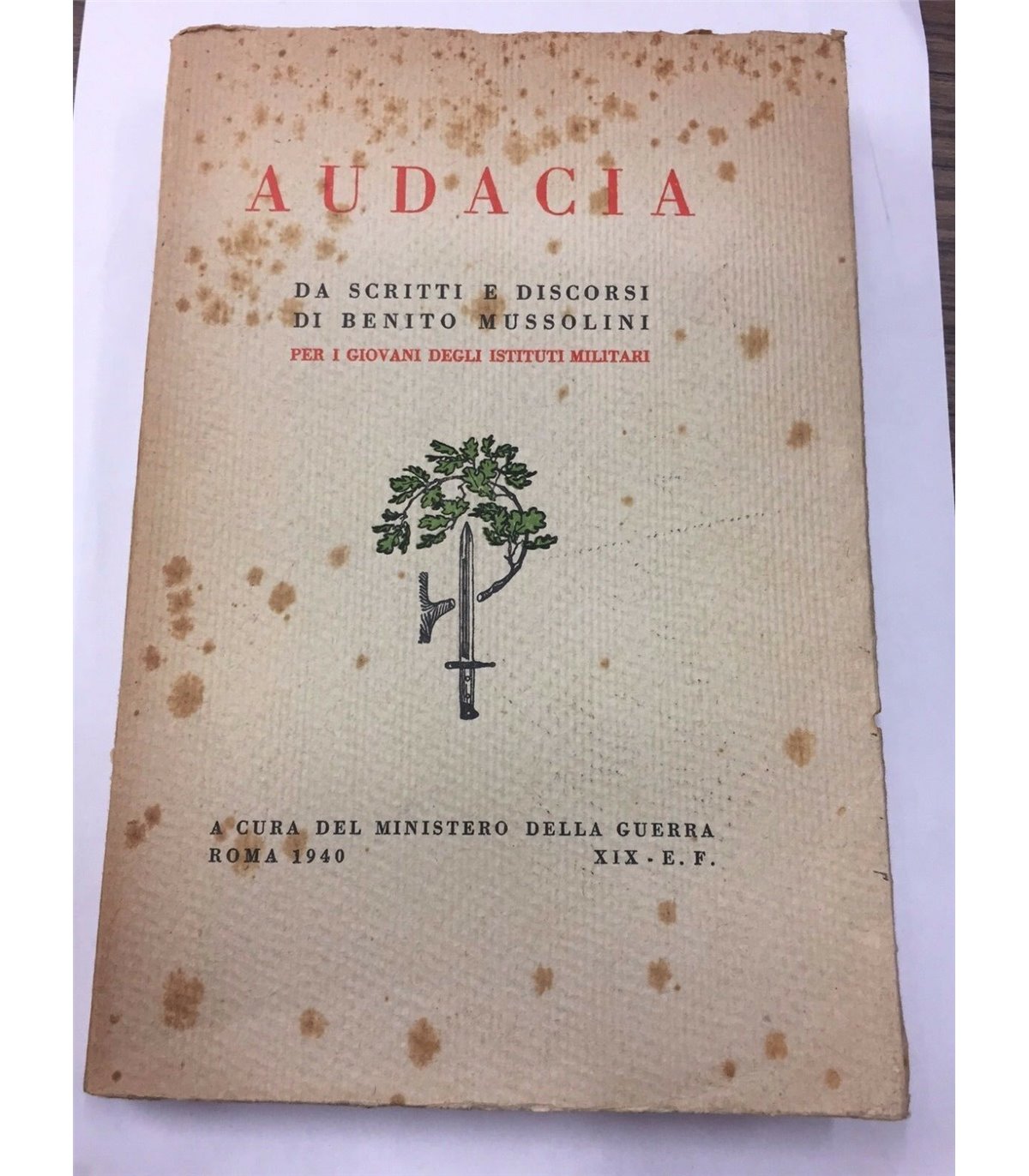 Da Scritti e discorsi di Benito Mussolini per i giovani degli istituti militari. Roma. A cura del Ministero della Guerra 1940, 8°, pp. 272. Bross. Bruniture.