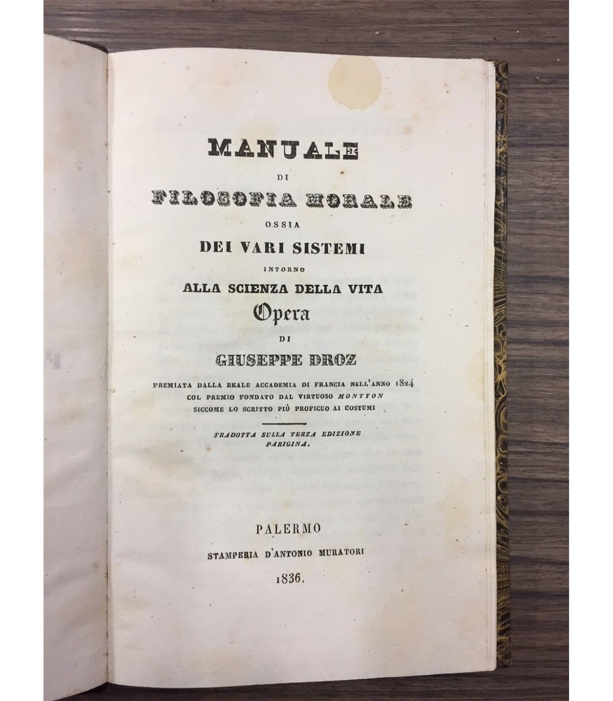 Opera di G.D. premiata dalla Reale Accademia di Francia nell'Anno 1824 col premio fondato dal virtuoso Montton siccome lo scritto più proficuo ai costumi. Tradotta sulla terza edizione parigina. Palermo. Stamperia di D'Antonio Muratori 1836, 16°, pp. X+184. Leg. mz pelle, tit. e fregi in oro al dorso. Bruniture.