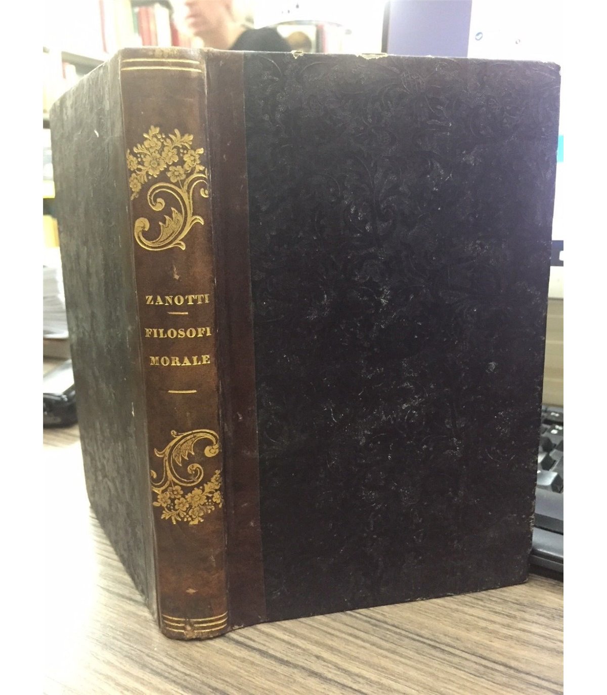 Ridotta in compendio dal signor F.M.Z. con un Ragionamento dello stesso sopra un Libro di Morale del sign. Di Mautpertuis dedicata all'illustrissimo Signor D. Antonino Cimino governatore, e lettore degli Ufficj nel Real Collegio di Chieti. Napoli 1777, 16°, pp. XVI+232. Capilettere e finalini incisi. Bruniture ma buon esemplare. Leg. mz pelle, tit. e fregi in oro al dorso.
