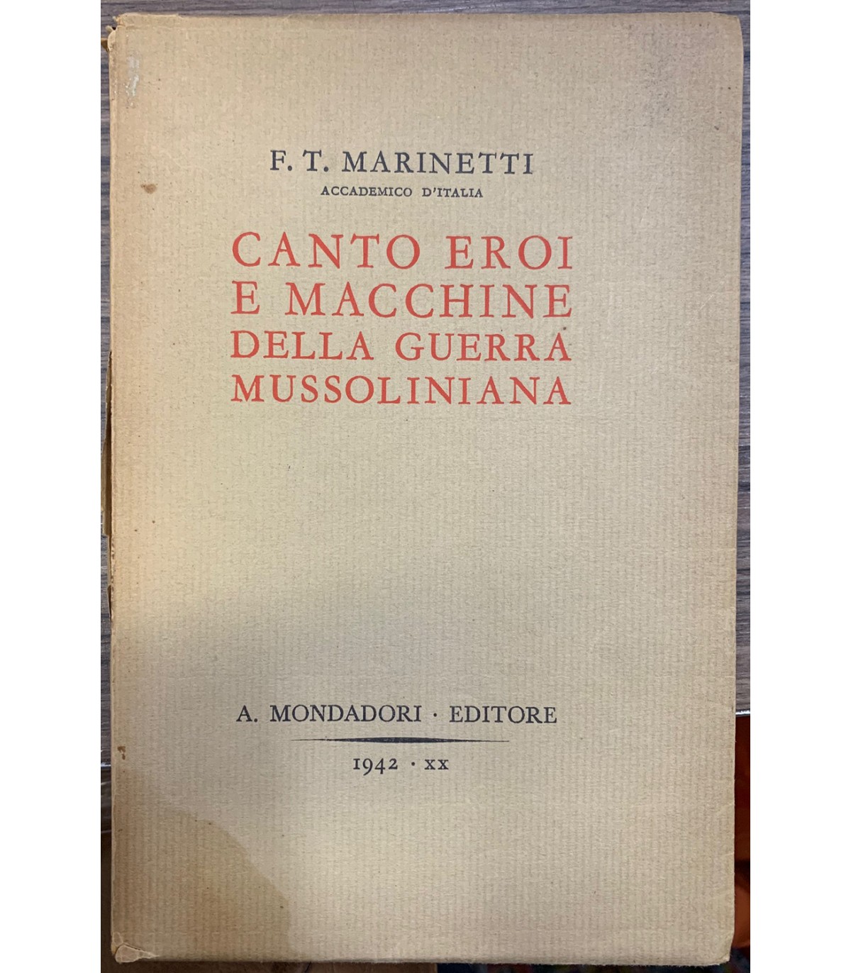 Aeropoema simultaneo in parole in libertà futuriste alla gloria di salvare Borsini Ciaravolo Visentini Pepe Bellotti Morgagni Balbo Bruno Mussolini Paagliarini e dei Gondarini Carabinieri di Culoquabert. Milano. Mondadori 1942, 16°, pp. 182. Bross editoriale con piccole mancazne al dorso e bruniture. Prima edfzione.