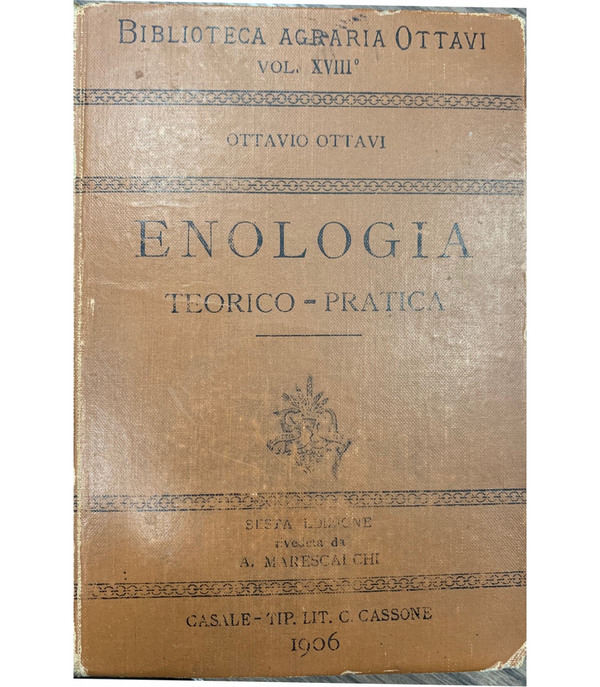 Monografia sui vini da pasto e da commercio e sui vini di lusso. Sesta edizione. Riveduta con importanti aggiunte e modificazioni dal Prof. Arturo Marescalchi. Casale Monferrato. Litografia Carlo Cassoni 1906, 16°, pp. XVI+870. Illustrato. Leg. Edit. Con segni del tempo.