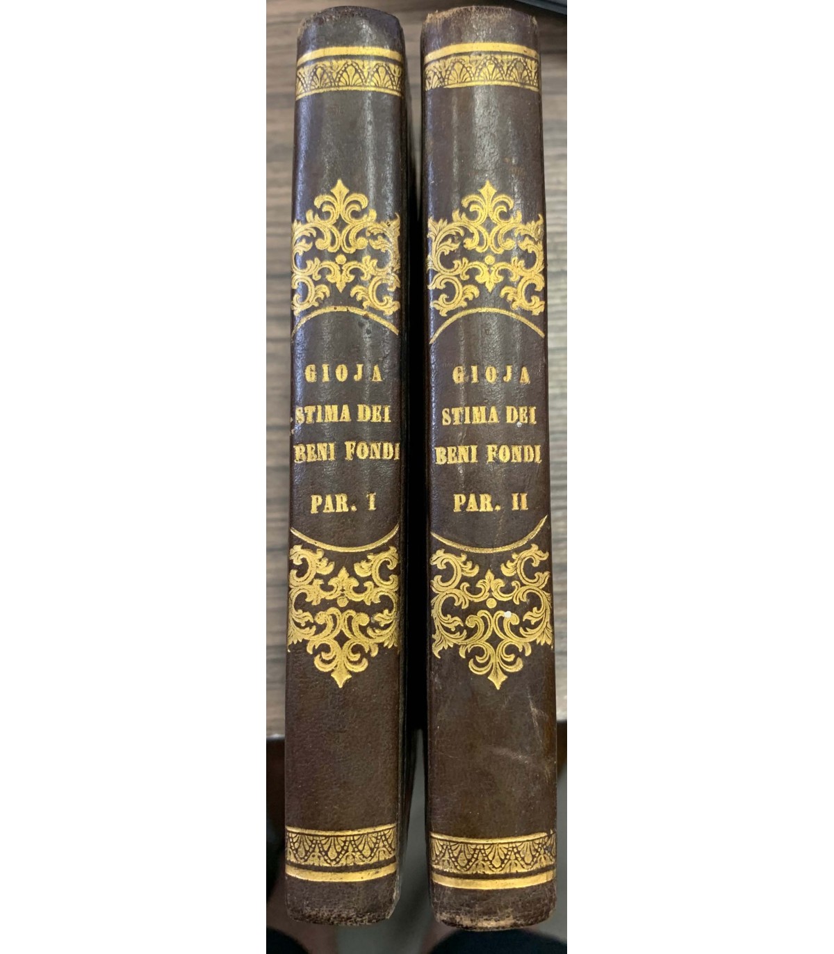 Compilato sulle tracce dei lavori relativi a tal soggetto inseriti nel prospetto delle scienze economiche di Melchiorre Gioja. E con l'aggiunta di tre separate memorie che trattano delle influenze della meteorologia nell'agricoltura, dei principi di economia applicati alle stime, e della storia, commerciabilità ed affrancazione delle enfiteusi. Terza edizione rettificata ed ampliata dall'Autore. Firenze. Paggi 1853, 16°, pp. 670, con tavole ripiegate f.t. Leg, mz pelle, tit. e fregi in oro al dorso. Bruniture.
