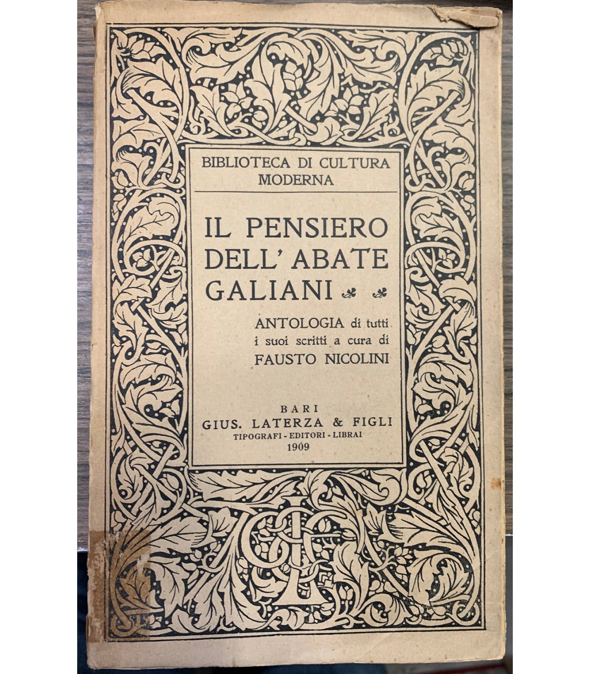 Antologia di tutti i suoi scritti a cura di Fausto Nicolini. Bari. Laterza 1909, 8°, pp. 442. Bross. Edit. Bruniture e mancanze marginali. Segni del tempo. Raro.