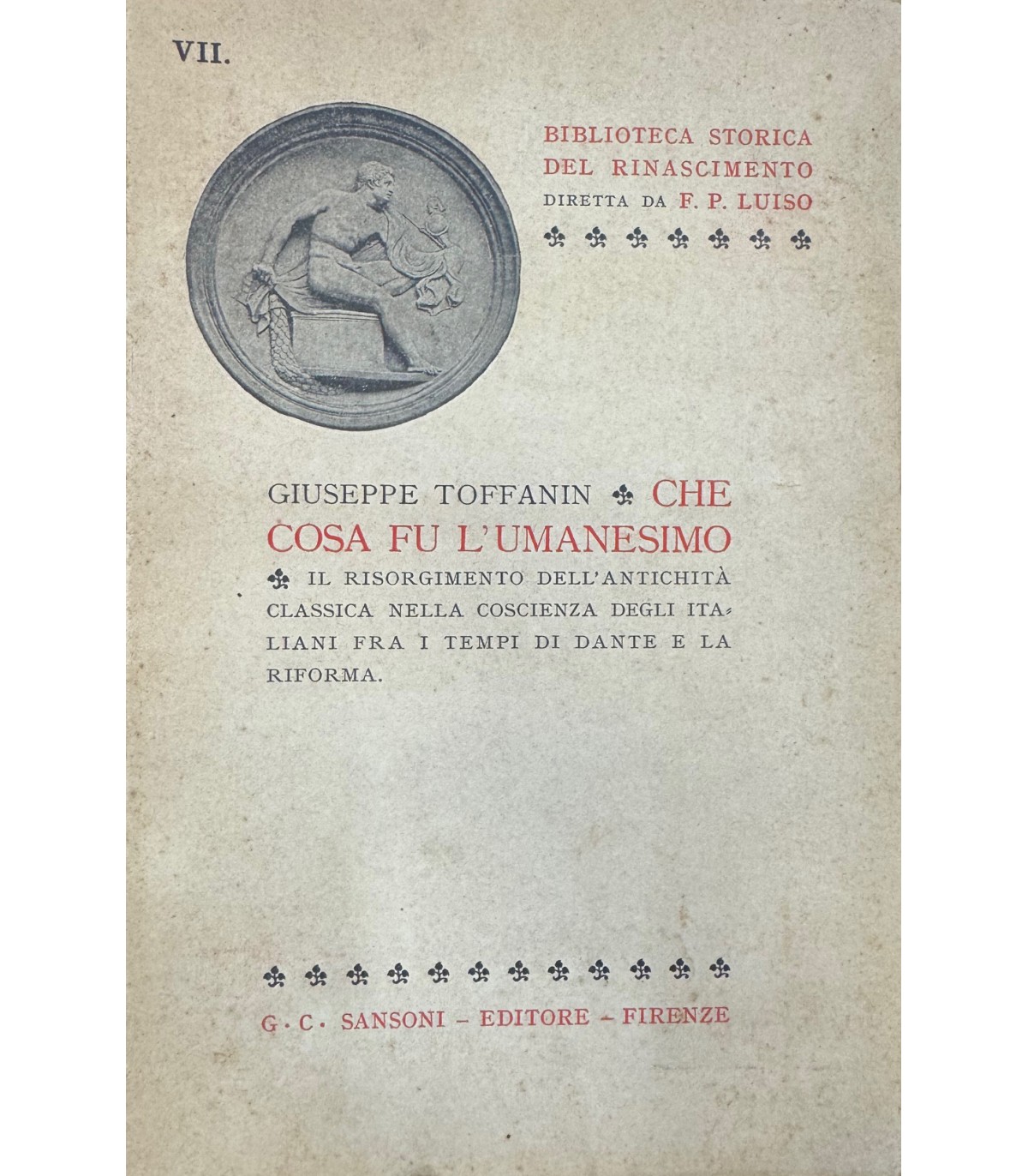 Il risorgimento dell'antichità classica nella cosceinza degli italiani tra i tempi di Dante e la riforma. Firenze. Sansoni 1920, 8°, pp. 136. Bross. Bruniture.