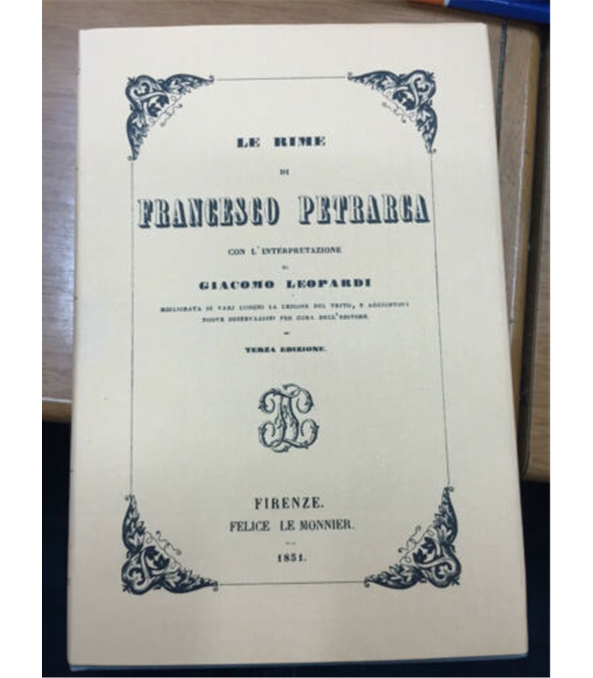 Con l'interpretazione di Giacomo Leopardi. Migliorata in vari luoghi la lezione del testo, e aggiuntovi nuove osservazioni per cura dell'editore. Firenze. Paoletti 1989, 16°, pp. 460. Ristampa dell'edizione Le Monnier 1851. Leg. Edit., sovracc. Cofanetto.