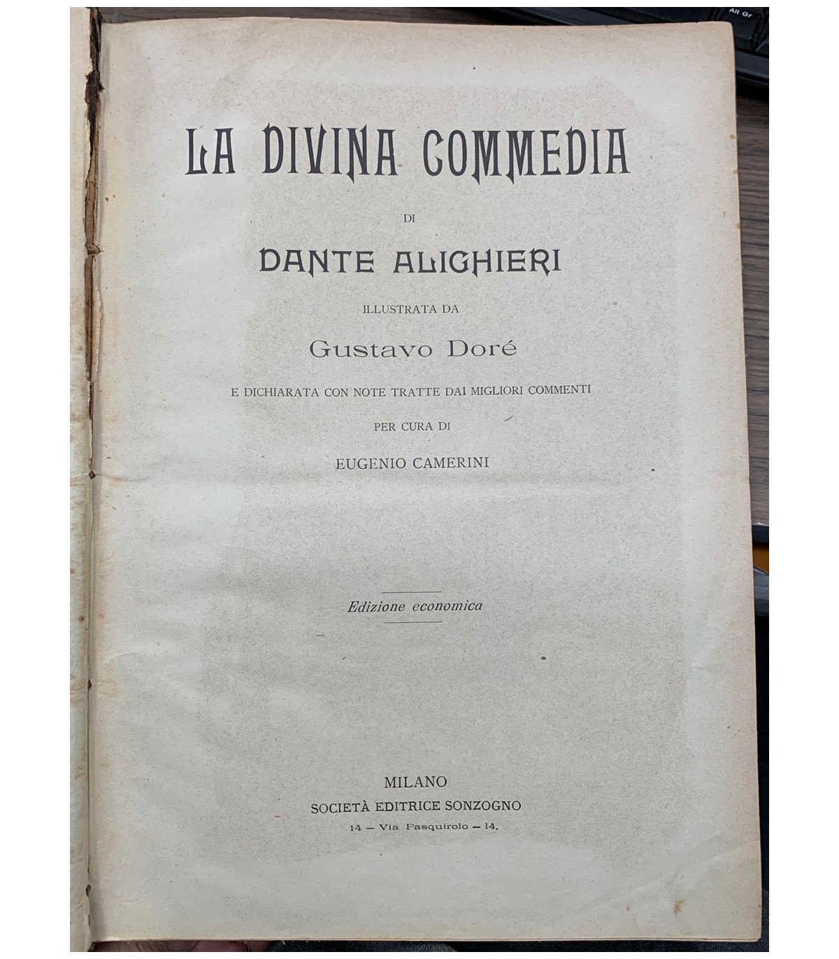 Illustrata da Gustavo Dorè e dichiarata con note tratte dai migliori conmenti per cura di Eugenio Camerini. Edizione Economica. Milano. Sonzogno 1911, 4°, pp. 680. Bruniture sparse dovute al tipo di carta. Leg. Mz pelle, tit. in oro al dorso con spellature e segni del tempo.