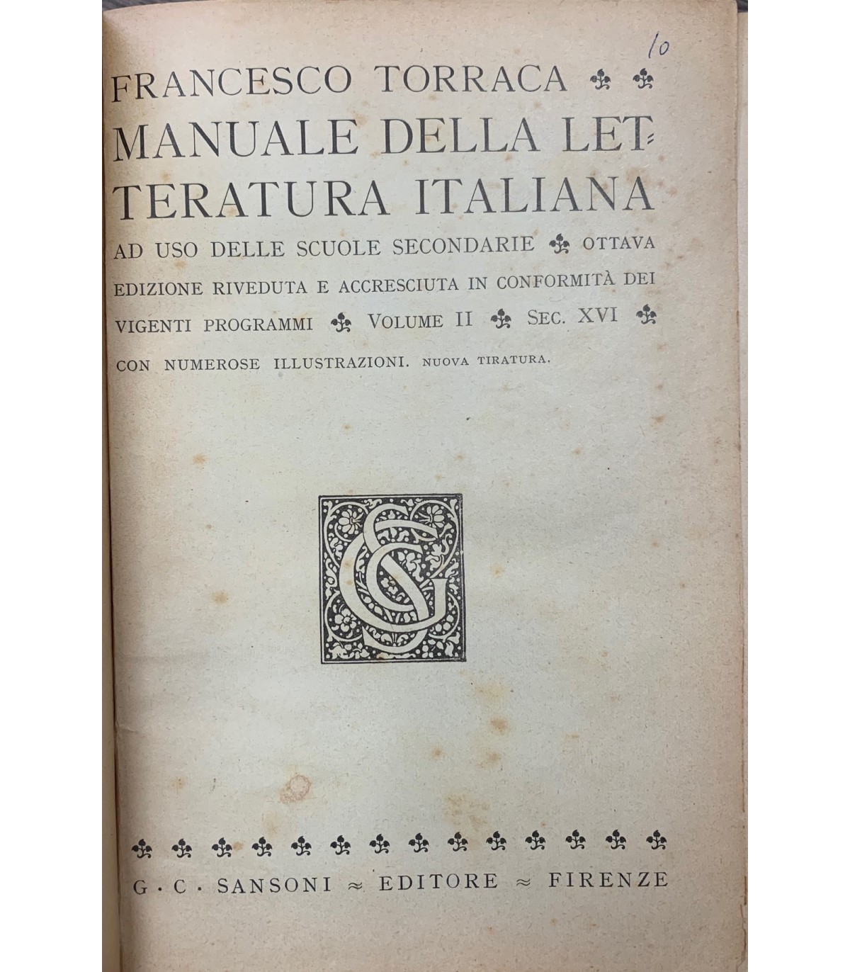 Ad uso delle scuole secondarie. Ottava edizione riveduta e accresciuta in conformità dei vigenti programmi. Sec. XVI. Con numerose illustrazioni. Nuova tiratura. Firenze. Sansoni 1929, 16°, pp. 420. Leg. Mz tela, muta. Bruniture.