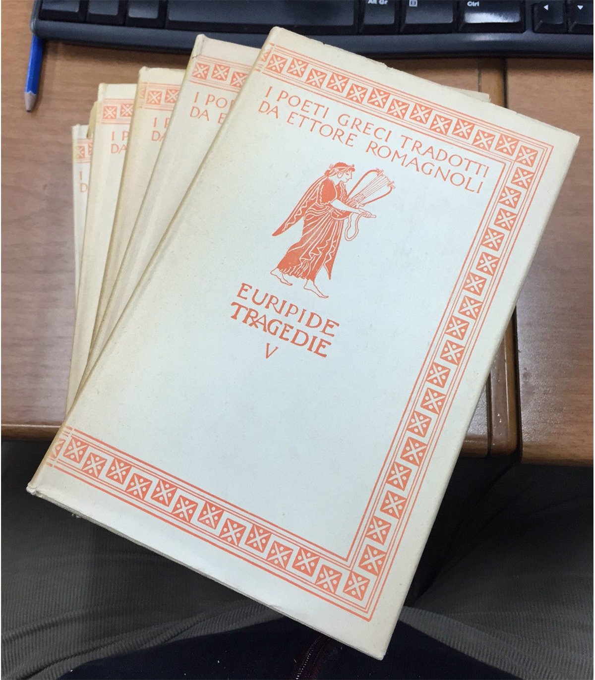 7 voll. I, Le Baccanti - Ione. II, Medea - Alcesti - Le Fenicie. III, Le supplici - Ercole - Ippolito. IV, Eraclidi - Ifigenia in Aulide - Ifigenia in Tauride. V, Reso - Le troadi - Ecuba. VI, Elettra - Oreste. VII, Andromaca - Elena - Il ciclope. Brologna. Zanichelli 1956, 16°, pp. 306+278+274+313+300+336+268, con incisioni di De Carolis. Leg. edit., sovracc. agli ultimi 3 volumi.