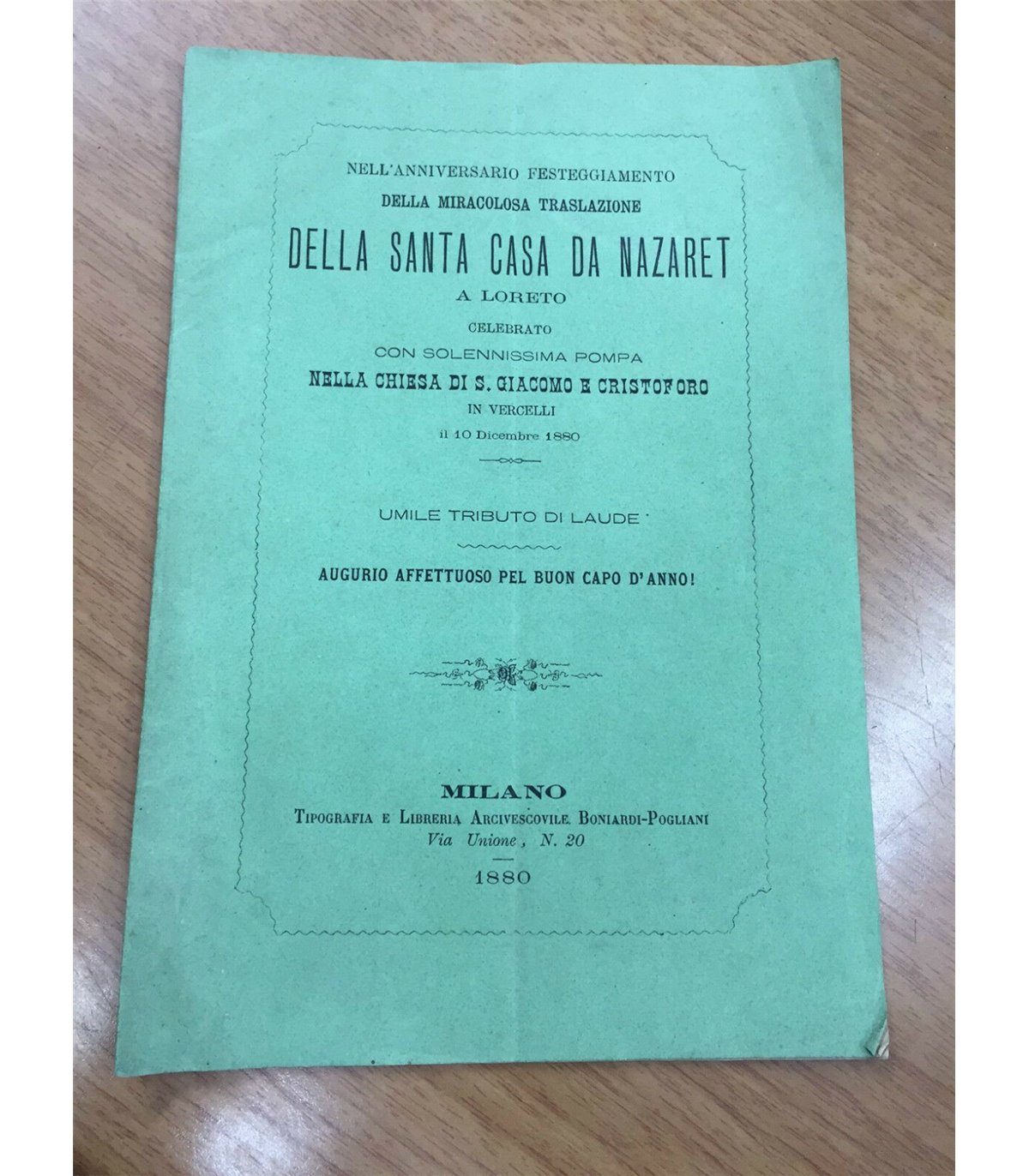 Celebrato con solennissima pompa nella chiesa di S. Giacomo e Cristoforo in Vercelli il 10 Dicembre 1880. Umile tributo di laude. Augurio affettuoso per buon capo d'Anno. Milano. Pogliani 1880, 16°, pp. 16. Bross. Edit.