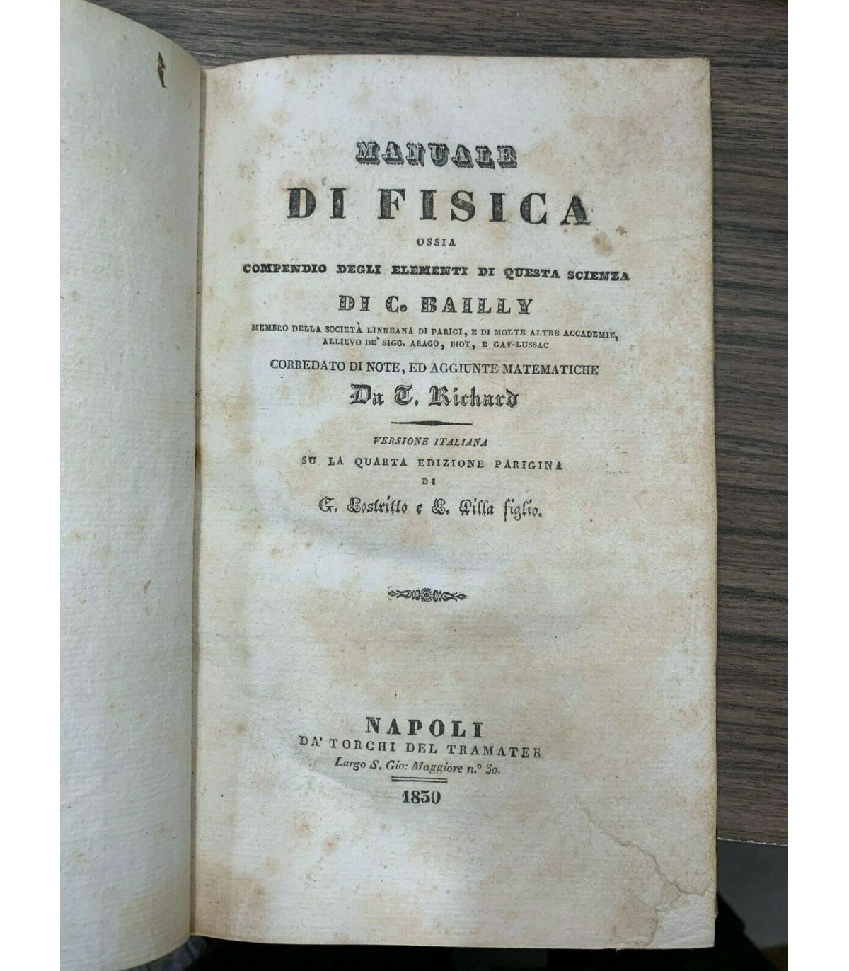 Ossia compendio degli elementi di questa scienza. Corredato di note, ed aggiunte matematiche.da C. Richard. Versione italiana su la quarta edizione parigina di G. Lostritto e L. Pilla figlio. Napoli. Tremater 1830, 16°, pp. XXV+242, con 3 tavole ripiegate f.t. con piccoli strappetti. Leg. mz pelle, tit. in oro al dorso.