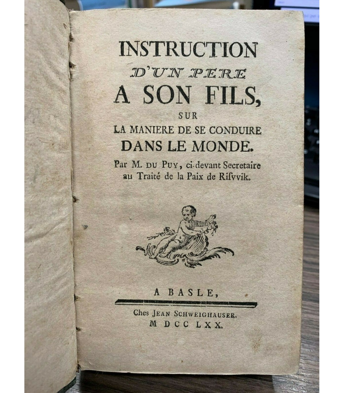 Par M. du Puy, ci devant Secretaire au Traitè de la Paic de Risvvik. Basle. Schweighauser 1770, 16°, pp. XXI+514. Capilettere e finalini incisi. Leg. Mz pelle, tit. e fregi in oro al dorso. Segni del tempo ma buon esemplare.