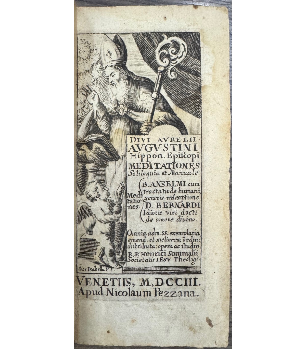 Soliloquiae et Manuale. Venetiis. Pezzana 1703, 24°, pp. 367+30nn. Frontespizio figurato. Bruniture e segni del tempo. Leg. Mz pelle, tit. in oro al dorso. Sbiaditure.