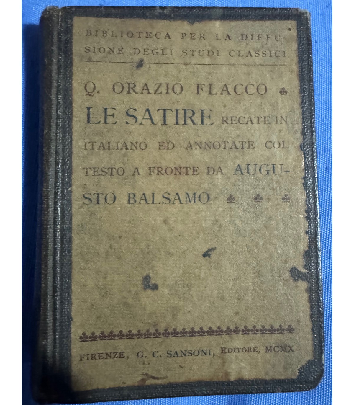 Recata in italiano ed annotate con testo a fronte da A., Balsamo.. Firenze. Sansoni 1910, 32°, pp. 362. Mancanze al margine interno delle prime 4 pagine con perdita di qualche lettera. Bruniture. Leg. Cart. Copertine applicate al piatto.