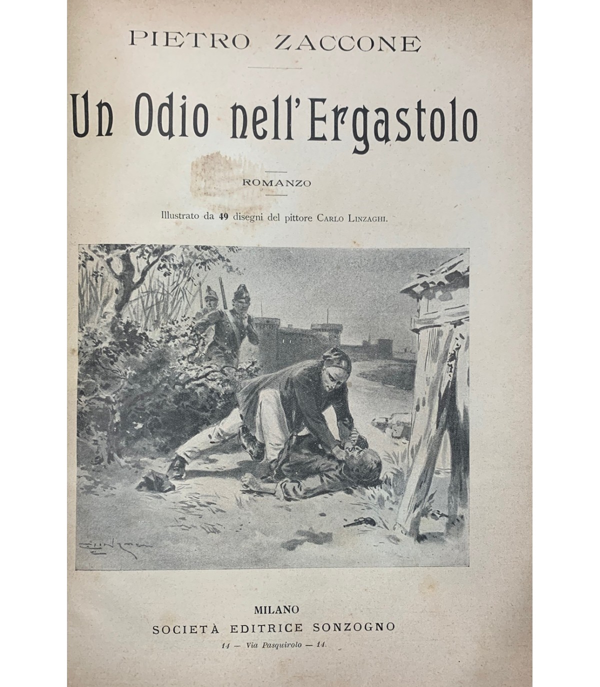 Romanzo. Milano. Sonzogno 1910, 8°, pp. 242, cfon 49 disegni del pittore C. Linzaghi. Leg, mz tela tit. in oro al dorso. Bruniture