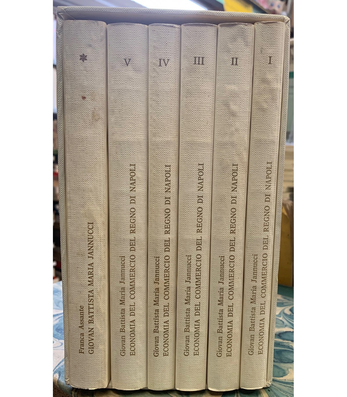 5 voll + 1 di Franca Assante. Giovan Battista Jannucci. Napoli. Giannini 1981, 8°, pp. 130-CCCXI. Tela editoriale. Cofanetto Segni del tempo ma buon esemplare.
