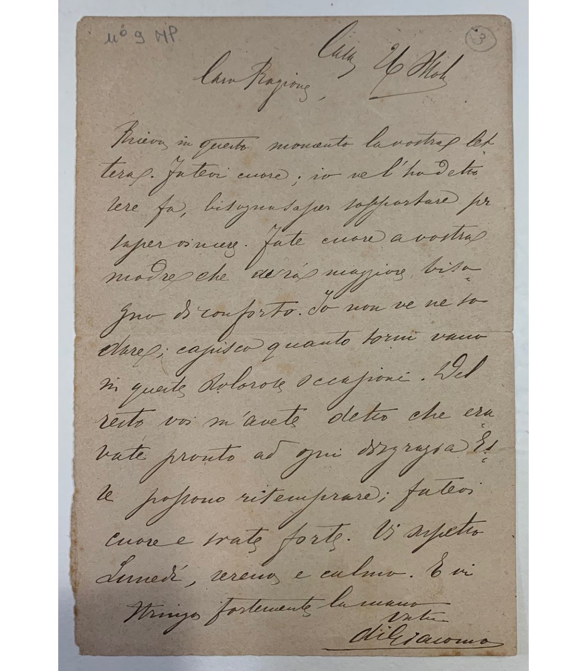Formato 15,5x10,5 scrittura su una sola facciata. Lettera personale che Di Giacomo invia a Raffaele Ragione pittore napoletano.