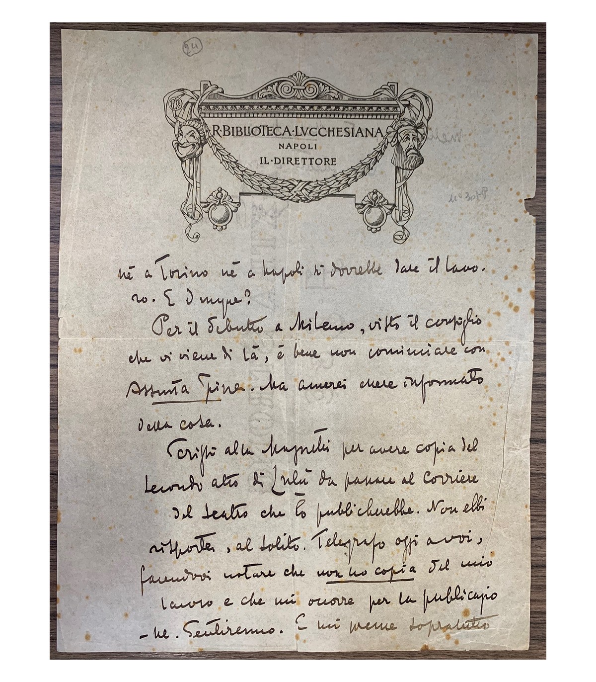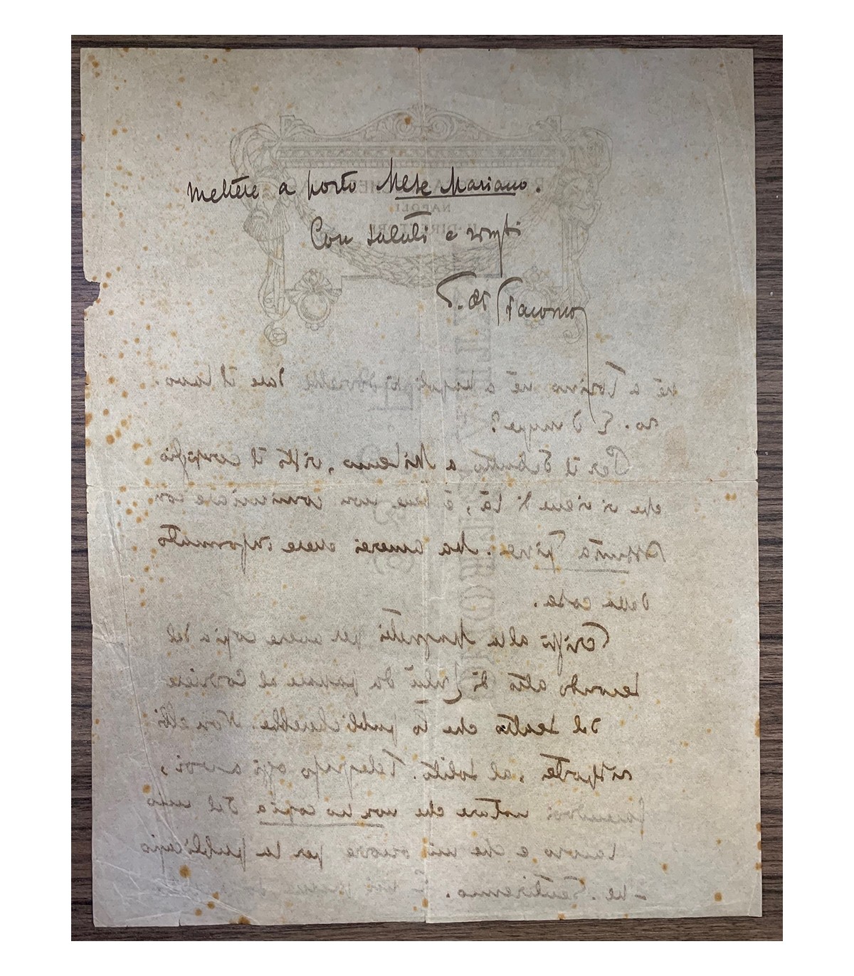 Probabilmente seconda parte di un lettera formata da due fogli senza destinatario ma indirizzata a colui che curava per lui le rappresentazioni teatrali, la lettera riguarda proprio la proposta del debutto a Milano di Assunta Spina e la messa a posto del Mese Mariano. Databile tra il 1909/1910, formato 27x20,5 cm scritta su due facciate su carta leggera. Autografo di Salvatore Di Giacomo. Segni del tempo.