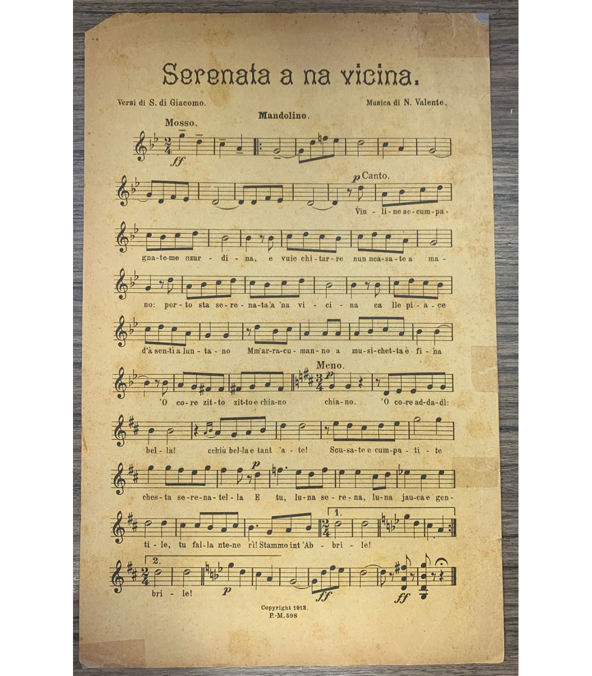 Le canzoni della Polyphon. Versi di S. Di Giacomo. Musica di M. Valente. Testo e spartito. Foglietto con illustrazione finemente incisa. Formato 27x17. Napoli. Gennarelli 1913. Piccole mancanze marginali