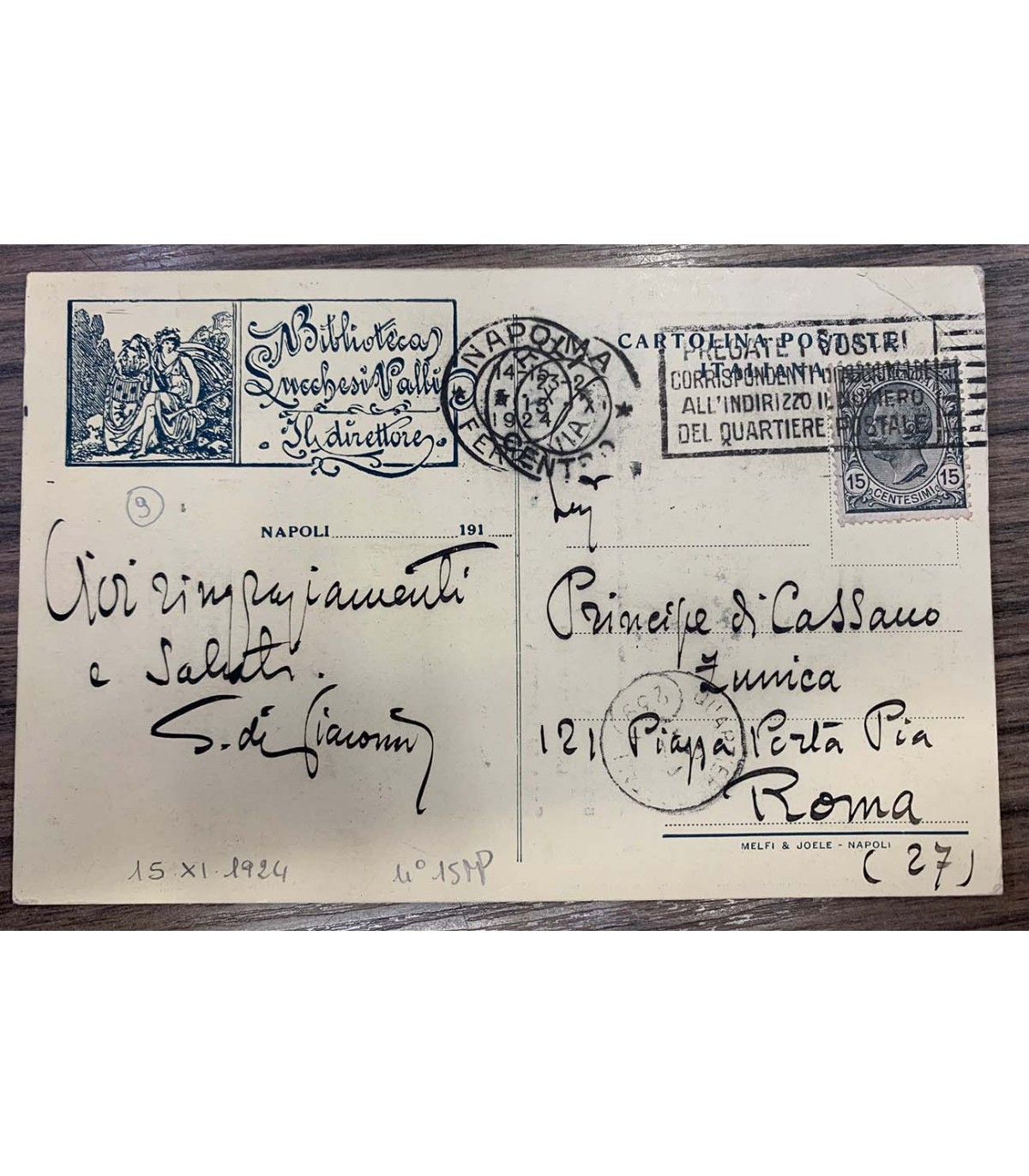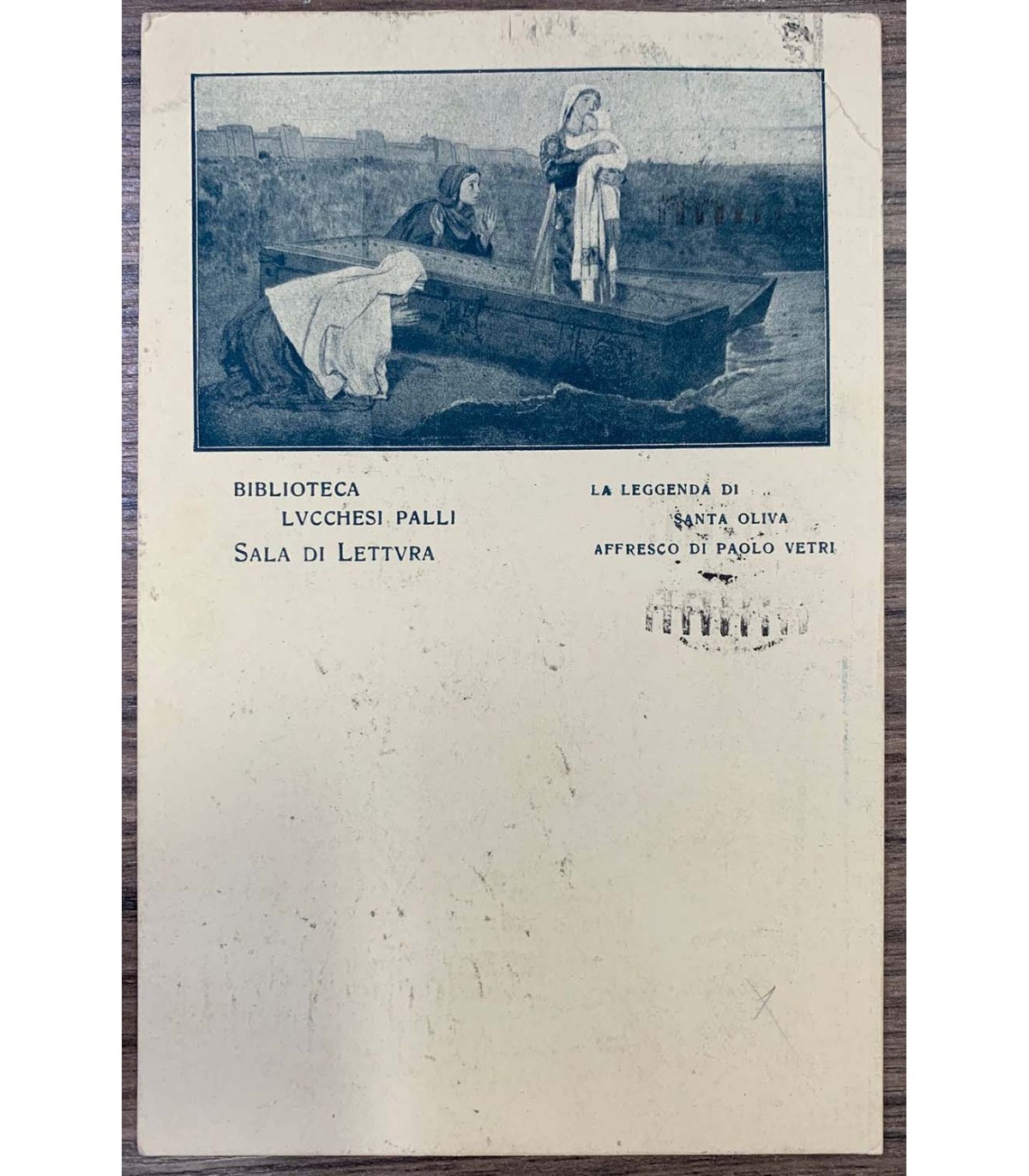 Cartolina postale spedita con intestazione Biblioteca Lucchesi Palli - Il direttore - Sala di Lettura. Spedita al Principe di Cassano Zunica a Roma. Timbro e francobollo datato 1924, dedica e autografo ad una facciata, al retro illustrazione raffigurante "La leggenda di Santa Olivia affresco di Paolo Vetri.