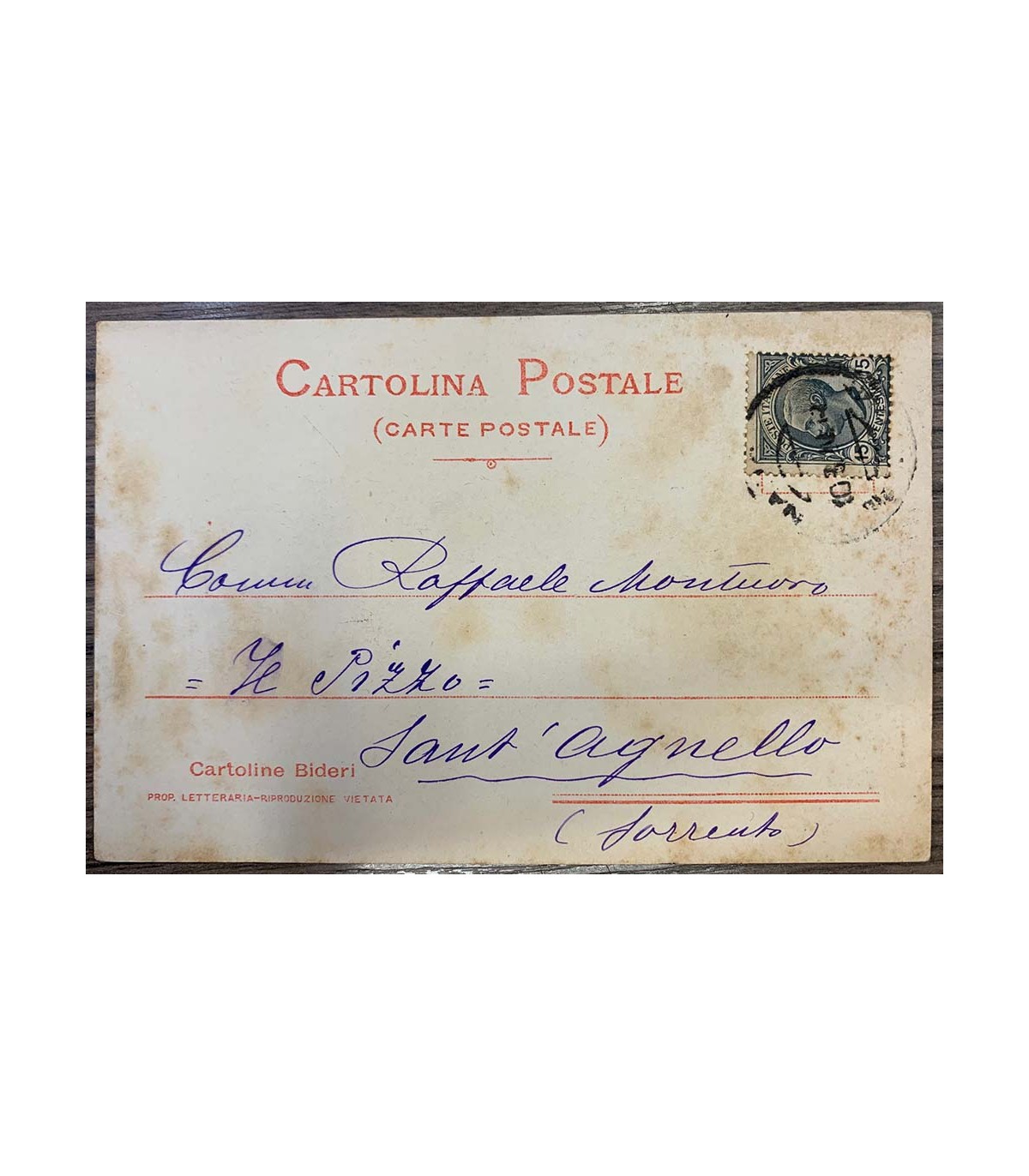 Cartolina formato 9x14cm destinata a Raffaele Montuoro "Il Pizzo" Sant'Agnello (Sorrento), cartoncino intestata Biblioteca Lucchesi Palli - Napoli con una figura a colori al piatto di Paolo Vetri - Affresco della grande sala. Il Pizzo era una pensioncina ubicata nei cosiddetti "Colli" e di trovava verso Sant'Agata (Località Picco Sant'Angelo). Cartolina viaggiata datata 10 agosto 1920 a carattere personale.