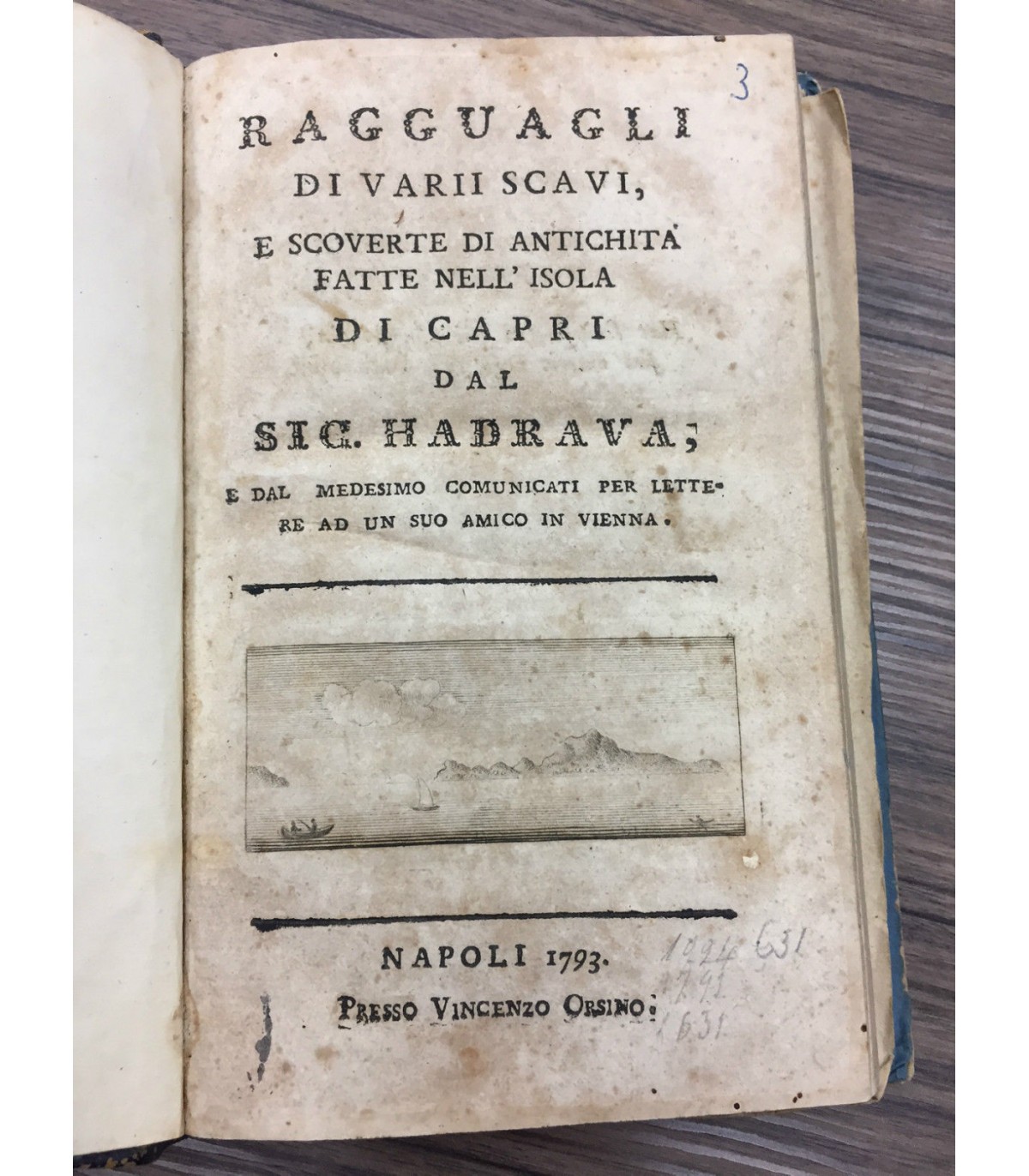 E dal medesimo comunicati per lettere ad un suo amico in Vienna. Napoli Presso Vincenzo Orsino 1793, 16°, pp. 134+(4), con una piccola incisione in antiporta evari finalini xilografici istoriati, con 8 tavole su 9 disponibili a fine testo ripiegate, di cui una raffigurante l'isola e una la grotta azzurra, manca la tavola n. 4. Bruniture dovute al tipo di carta. Leg, mz pelle ottocentesca con tassello, spellature e mancanze. Rara edizione originale