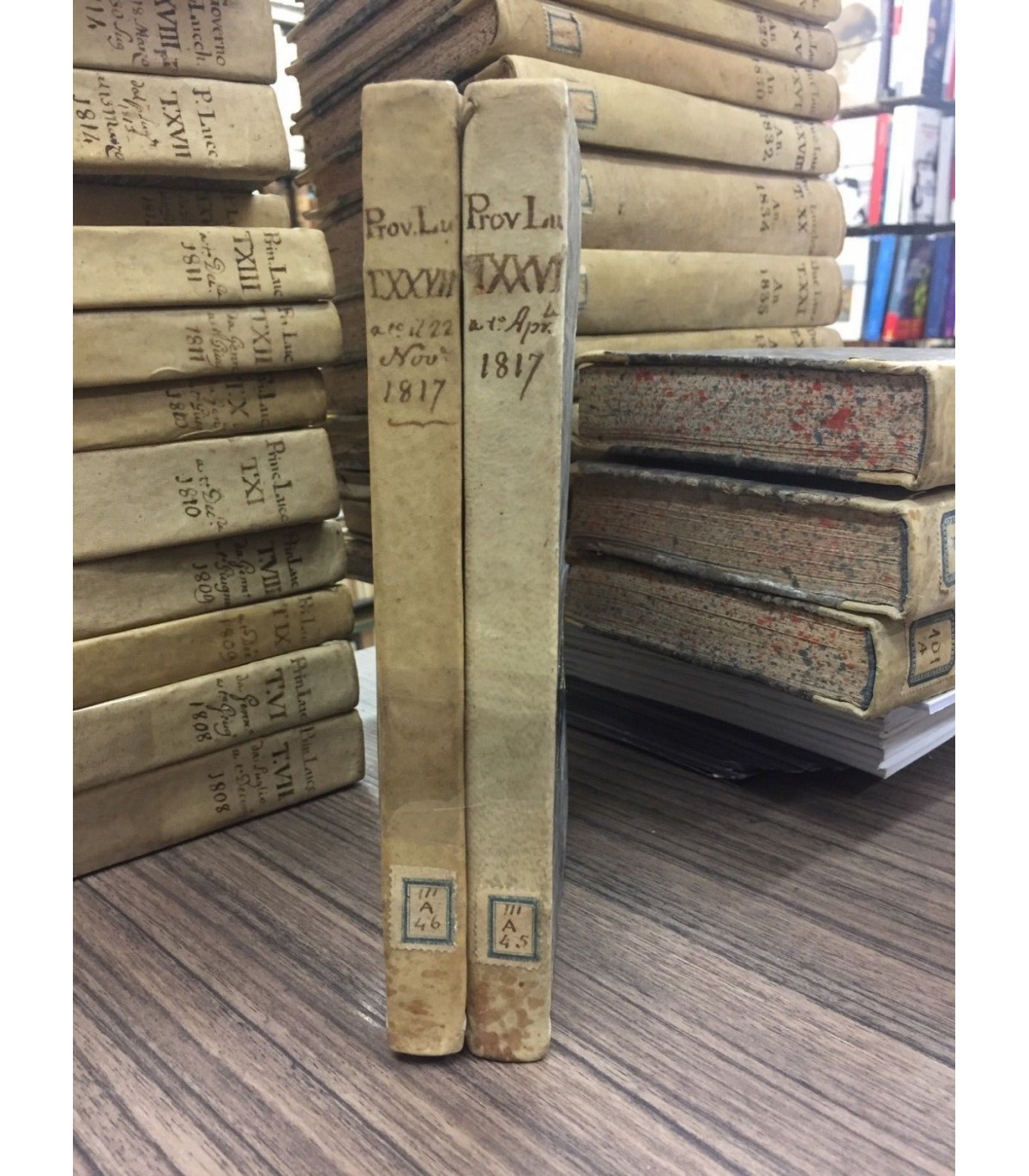 Lucca. Bertini, volumi in 16° con legatura in mz pergamena con tit. calligrafati al dorso. Segni del tempo e qualche traccia d'umido che non lede il testo se non indicato. 1. Tomo XXVI, 1817, pp. 180. 2. Tomo XXVII, 1817, pp. 172, tracce d'umido accentuate.